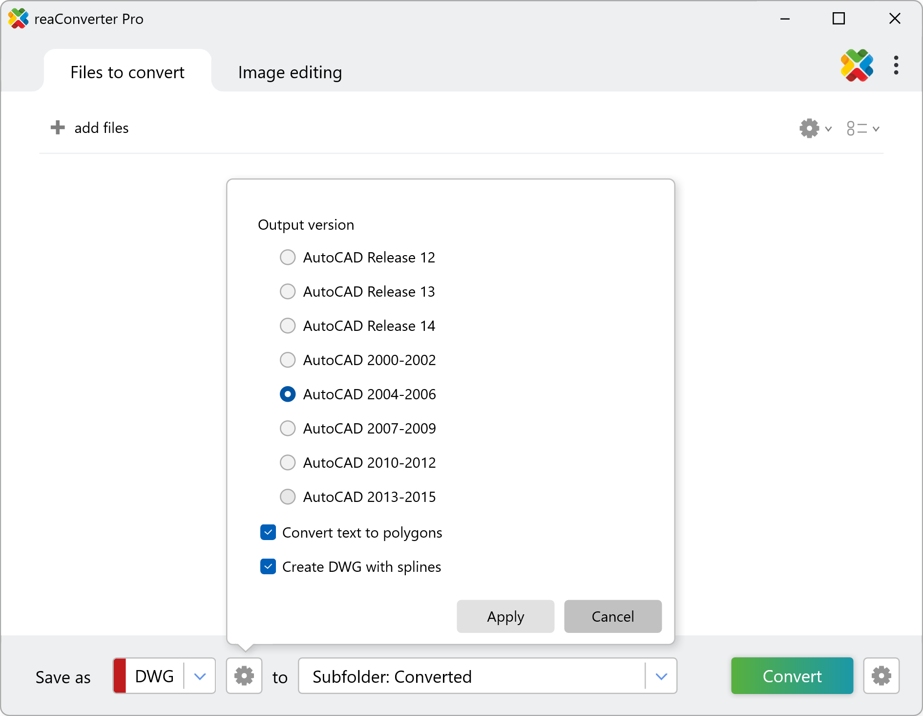 The fastest and easiest way to select an AutoCAD version when converting to DWG or DXF is with reaConverter.