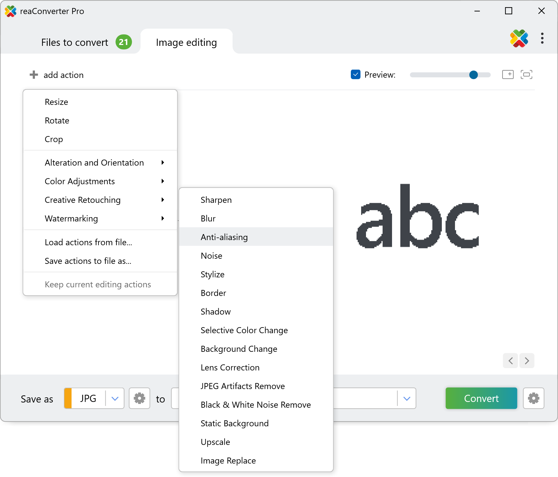 The fast and easy way to apply anti-aliasing on your PC is to use reaConverter. The software runs completely offline, keeping your files safe and private.