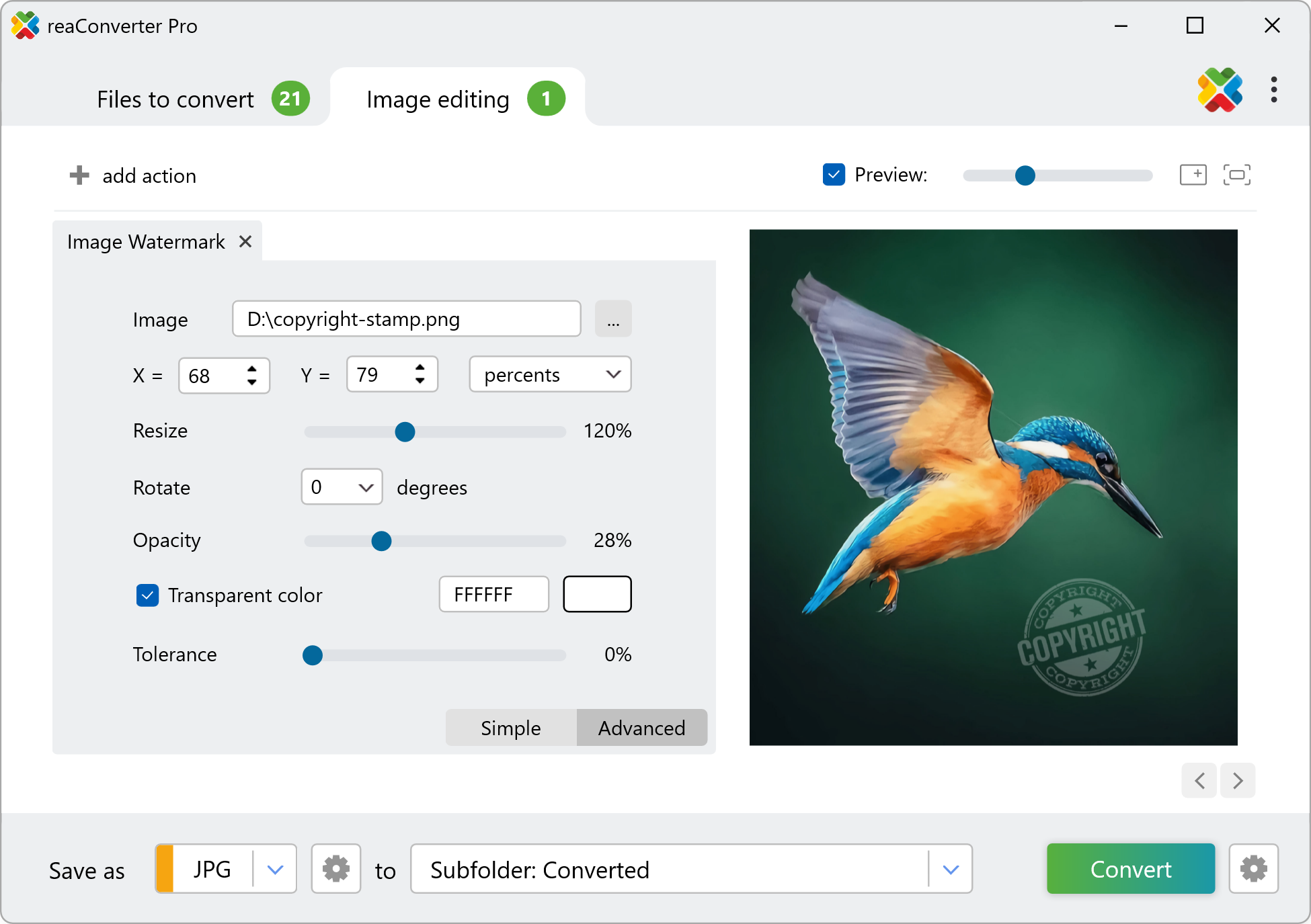 Here you can opt for the simple watermarking interface, where you just add the desired watermark image and the coordinates defining its position on the image, or the advanced one. The latter allows you to resize, rotate and set the opacity of the watermark image, as well as customize the color tolerance and transparency of the watermark.