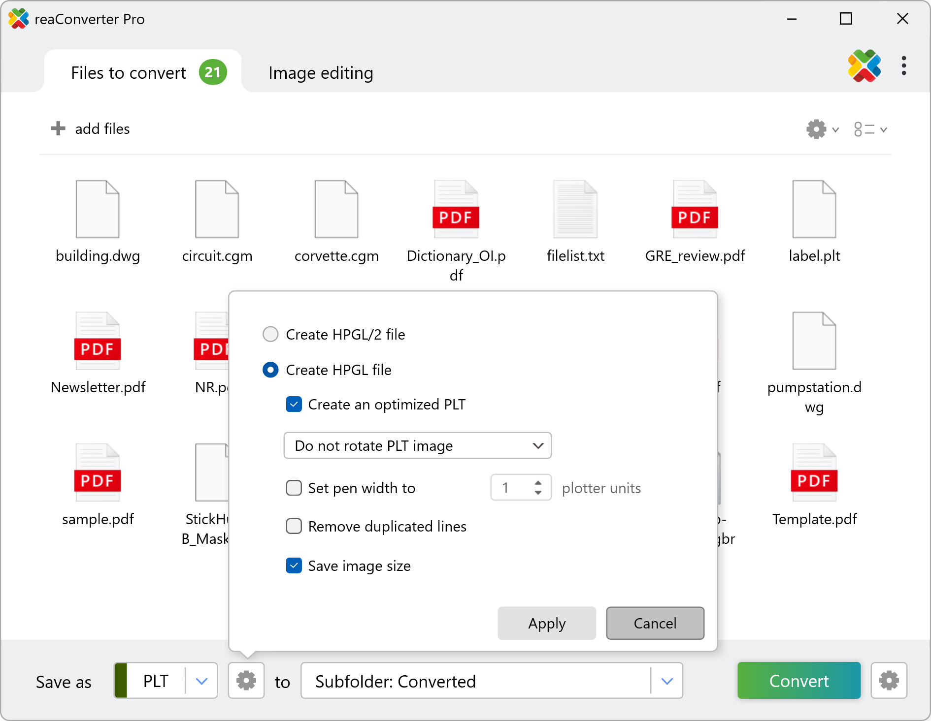 Need high-quality PLT files? With reaConverter, you can quickly convert images to optimized PLT format — completely offline for maximum privacy and security.