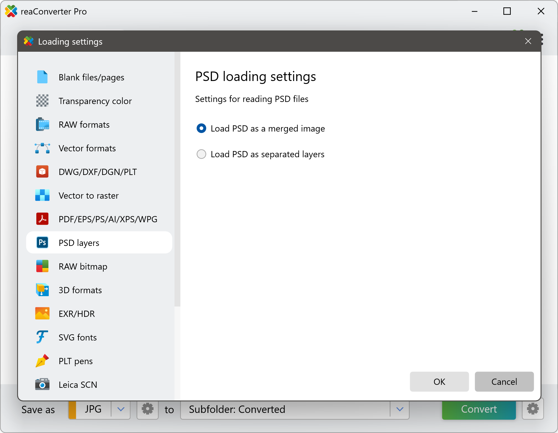 In this window, you can choose how PSD files should be loaded before conversion: