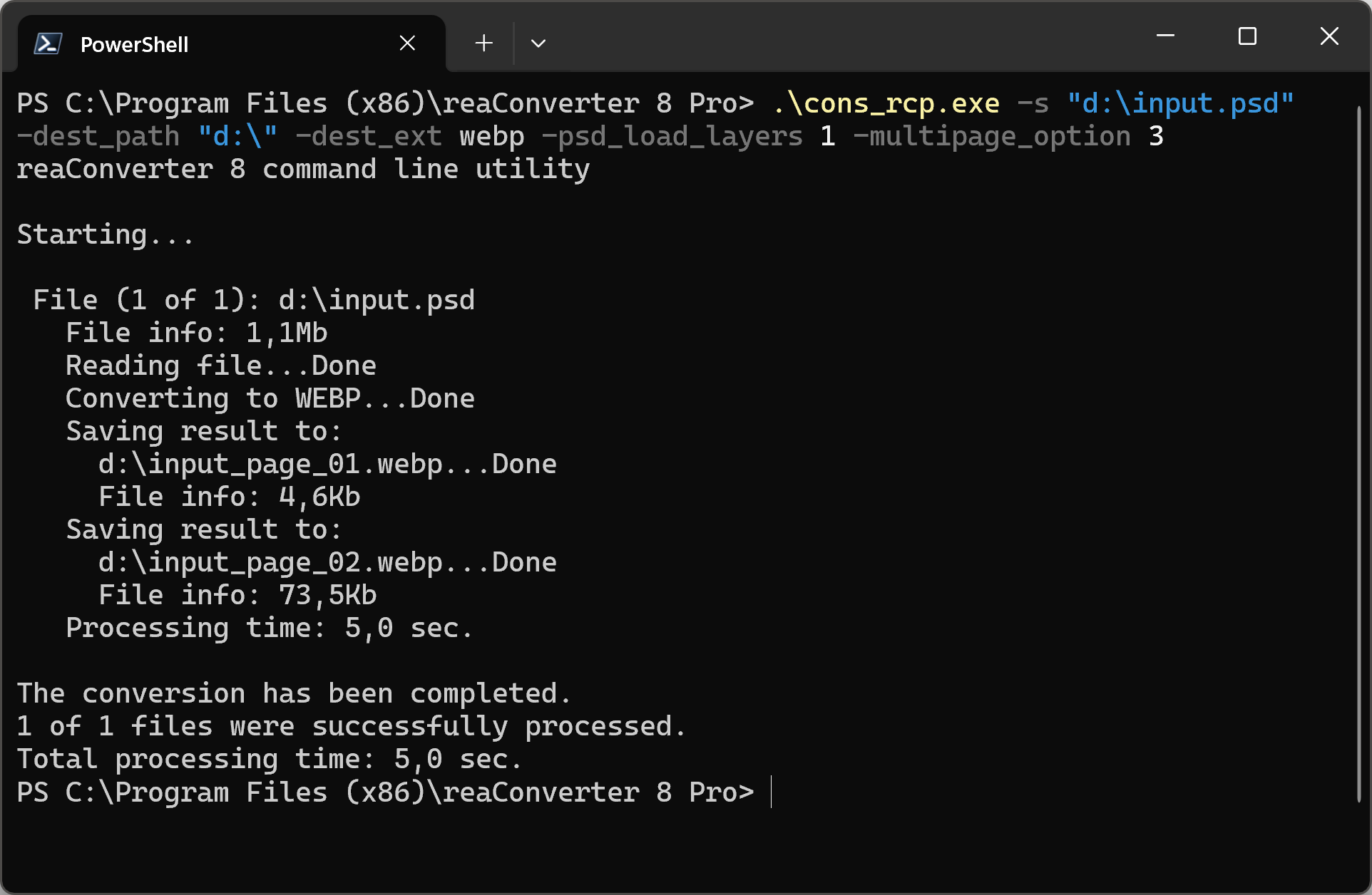cons_rcp.exe -s "C:\Path_to\input_file.psd" -dest_path "C:\Path_to\output_files\" -dest_ext webp -webp_quality 100 -psd_load_layers 1 -multipage_option 3