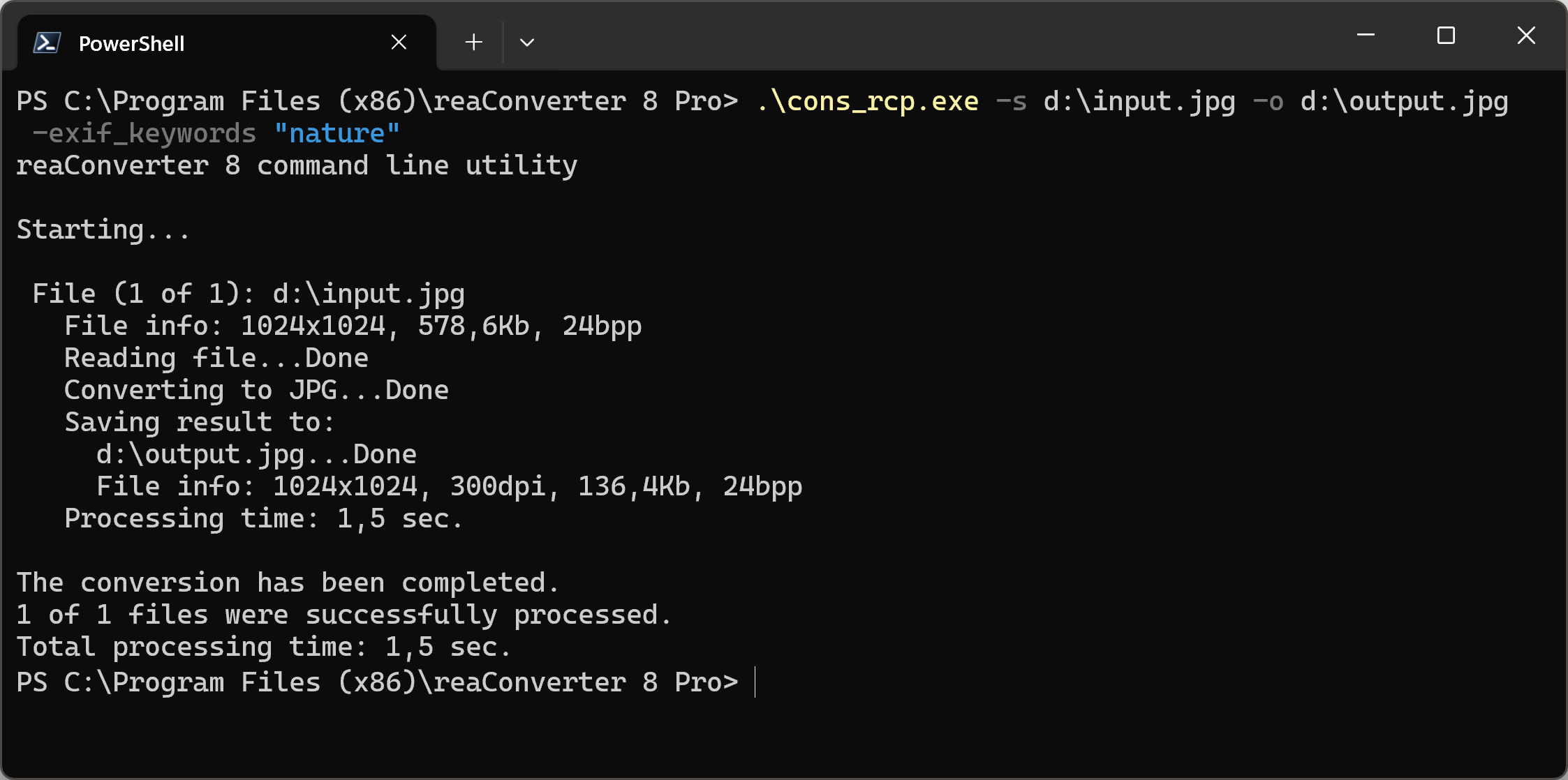 You can also set new metadata using command-line interface, either manually or through automated scripts. reaConverter Pro includes a command-line tool called cons_rcp.exe — an advanced feature designed for professional use, available exclusively in the Pro edition.