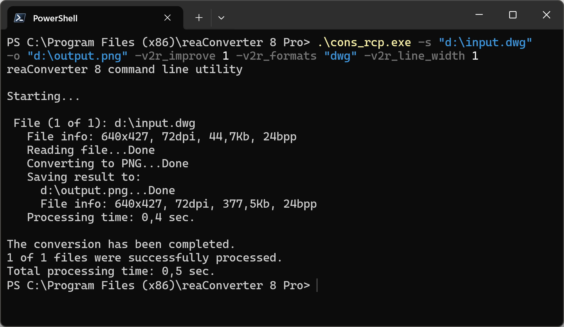 You can convert vector files using command-line interface, either manually or through automated scripts. reaConverter Pro includes a command-line tool called cons_rcp.exe — an advanced feature designed for professional use, available exclusively in the Pro edition.