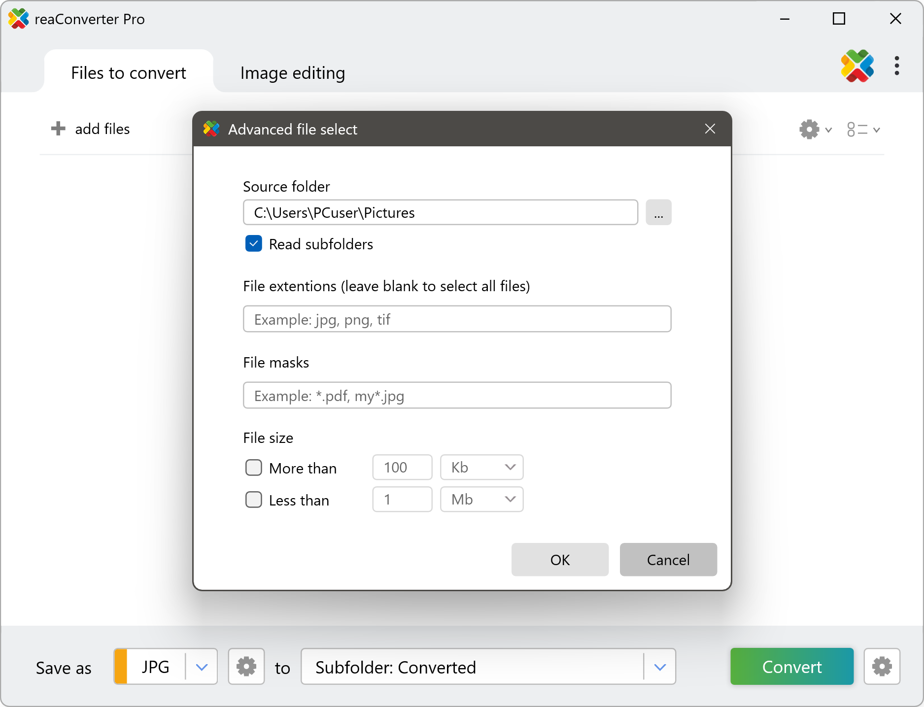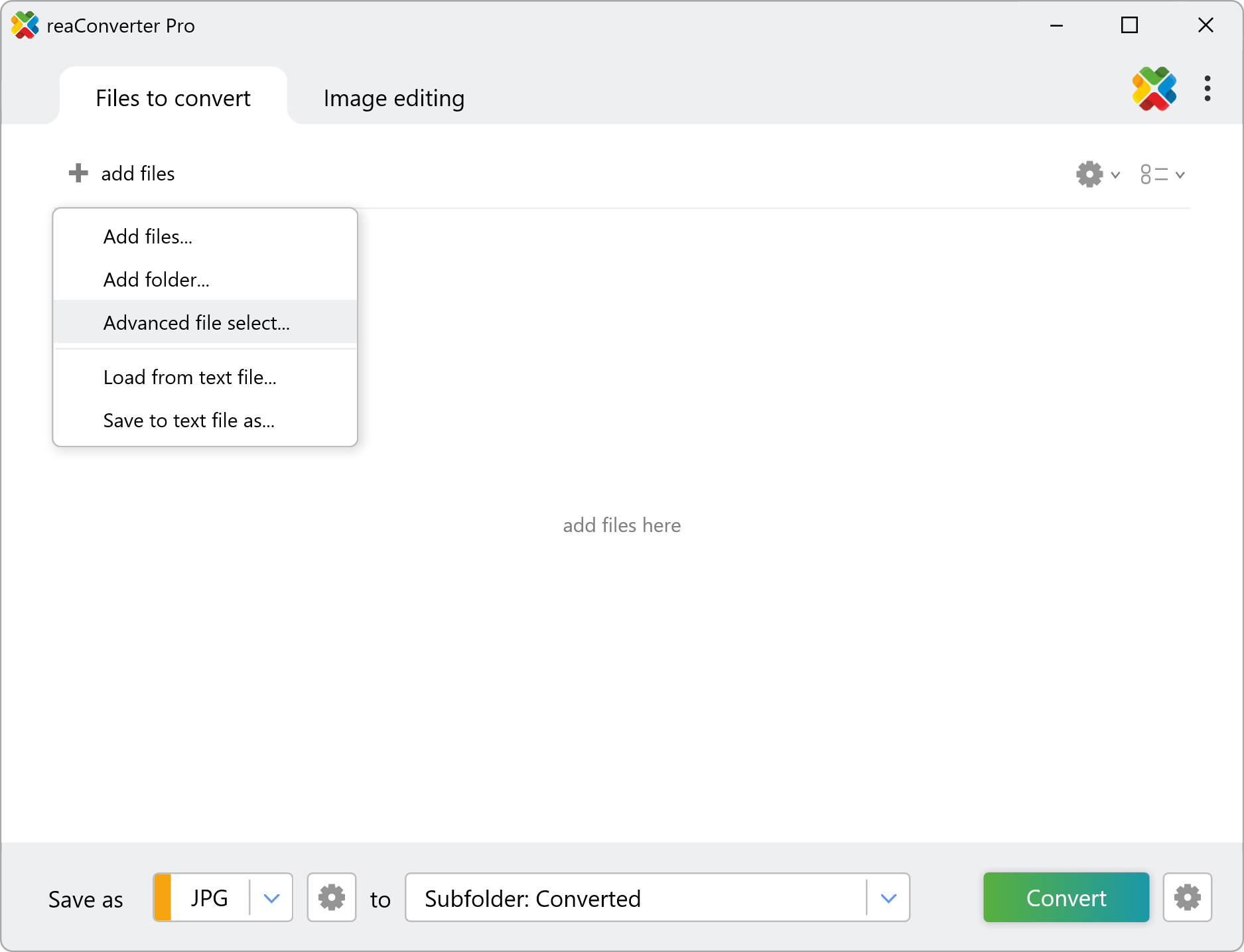 In reaConverter's main window, go to the + add files → Advanced file select...