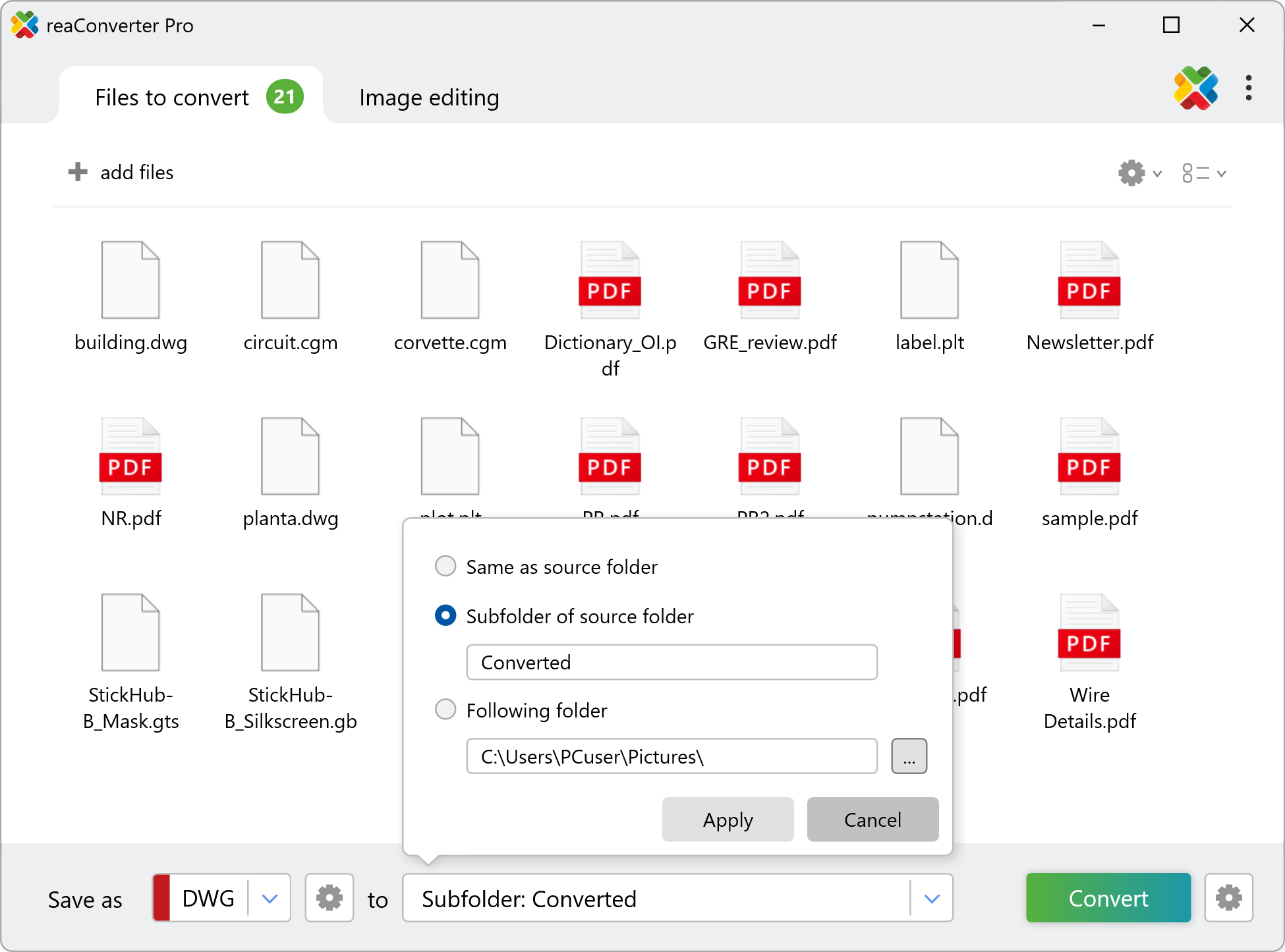 Add one or more files you intend to convert to DWG or DXF. Pick them manually from your local hard drive or drag-and-drop them into the reaConverter window.