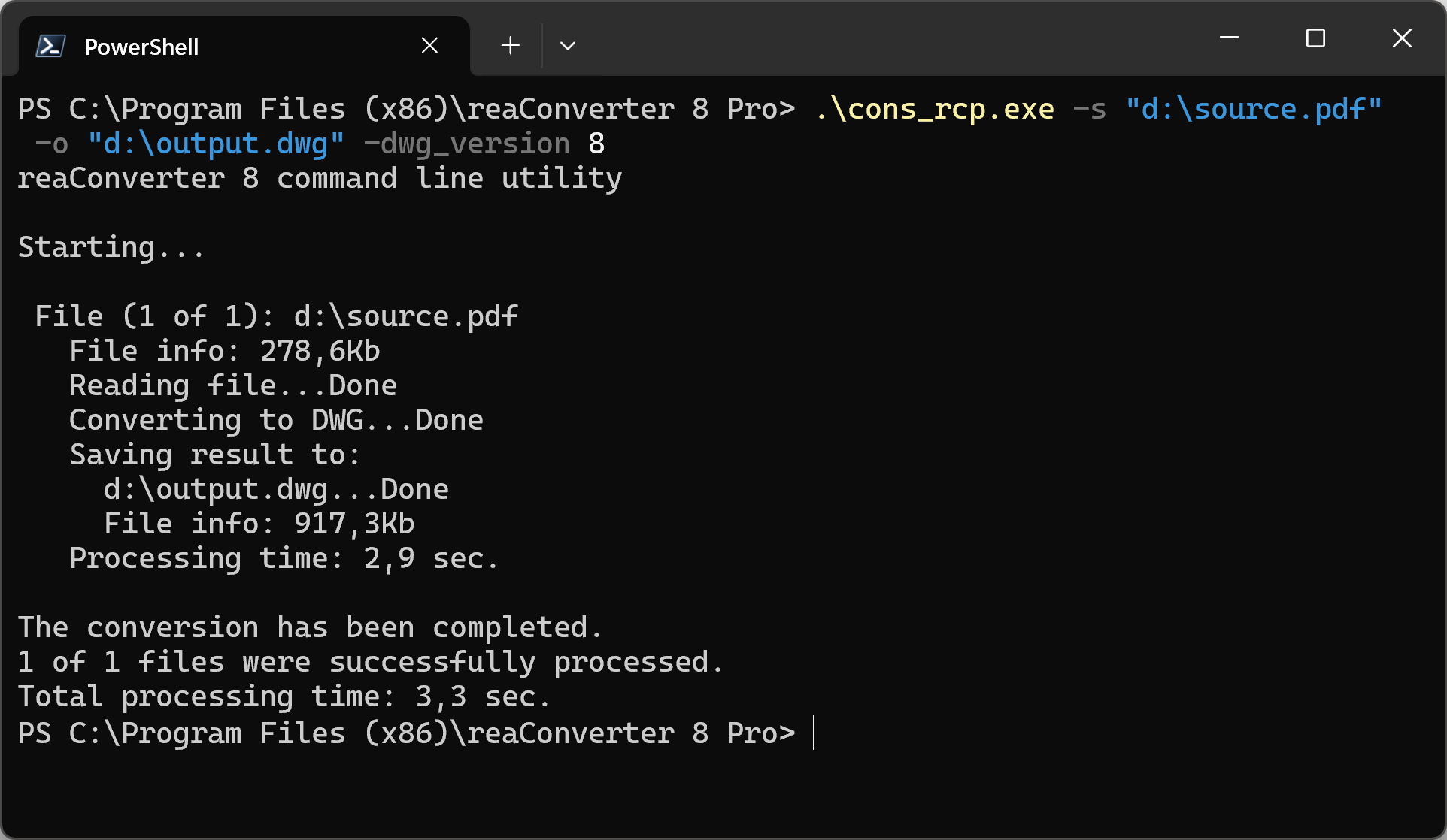 cons_rcp.exe -s "C:\Path_to\input_file.pdf" -o "C:\Path_to\output_file.dwg" -dwg_version 8