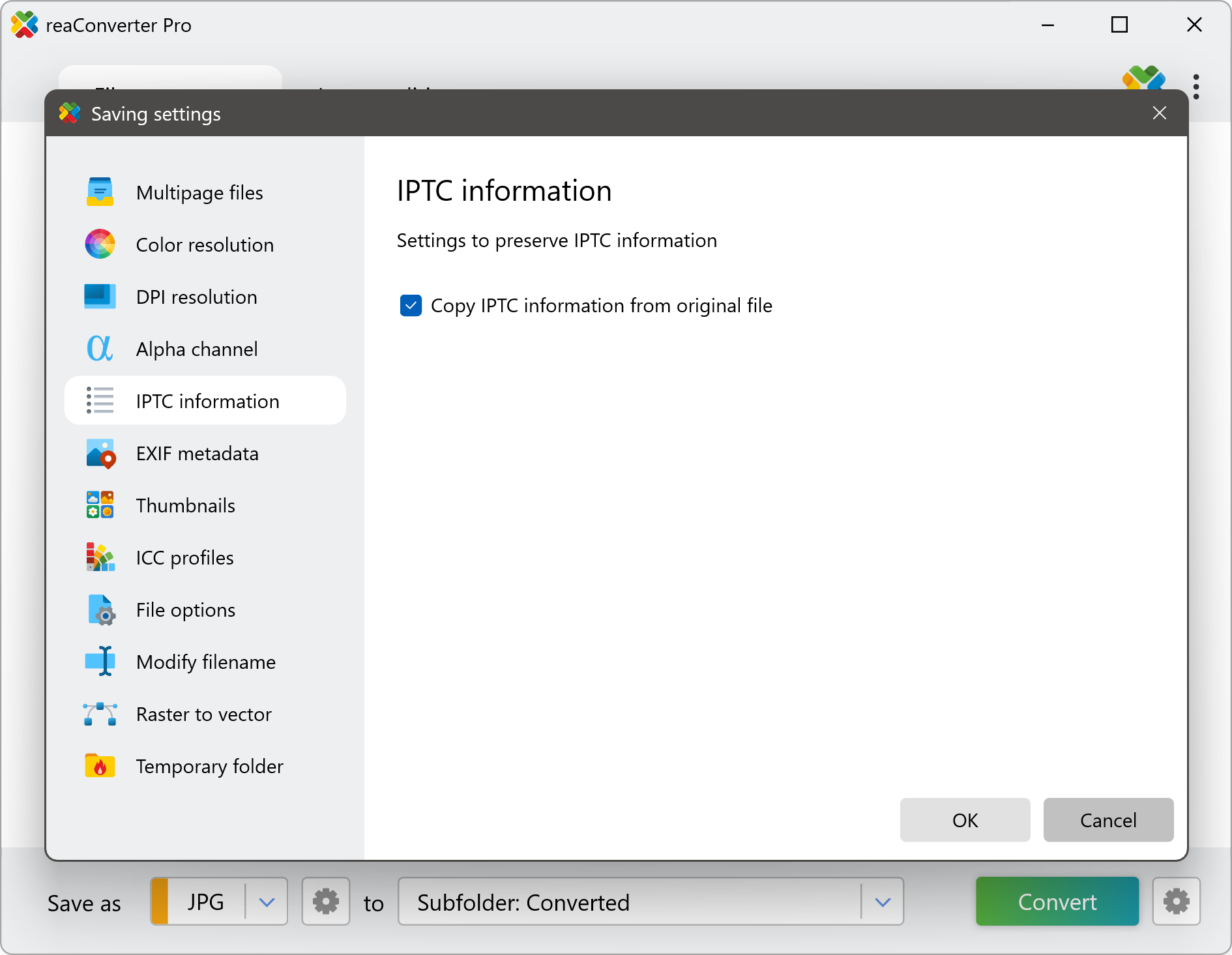 Go to Menu → Saving settings → Additional saving settings and find the EXIF and IPTC tabs. Then simply tick the relevant boxes to copy EXIF and IPTC information from the original file to the converted one.