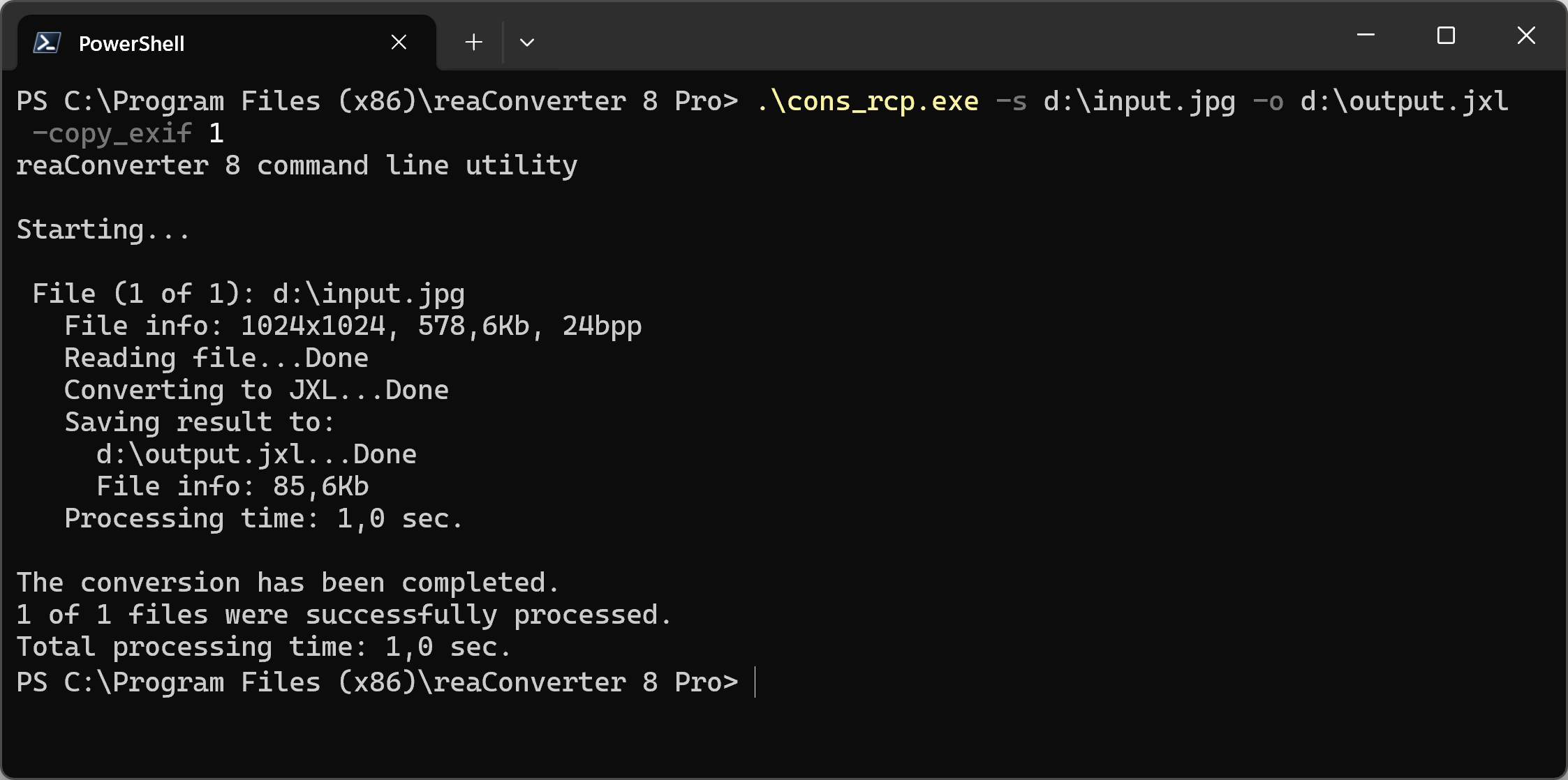 cons_rcp.exe -s "C:\Path_to\input_file.jpg" -o "C:\Path_to\output_file.jxl" -copy_exif 1