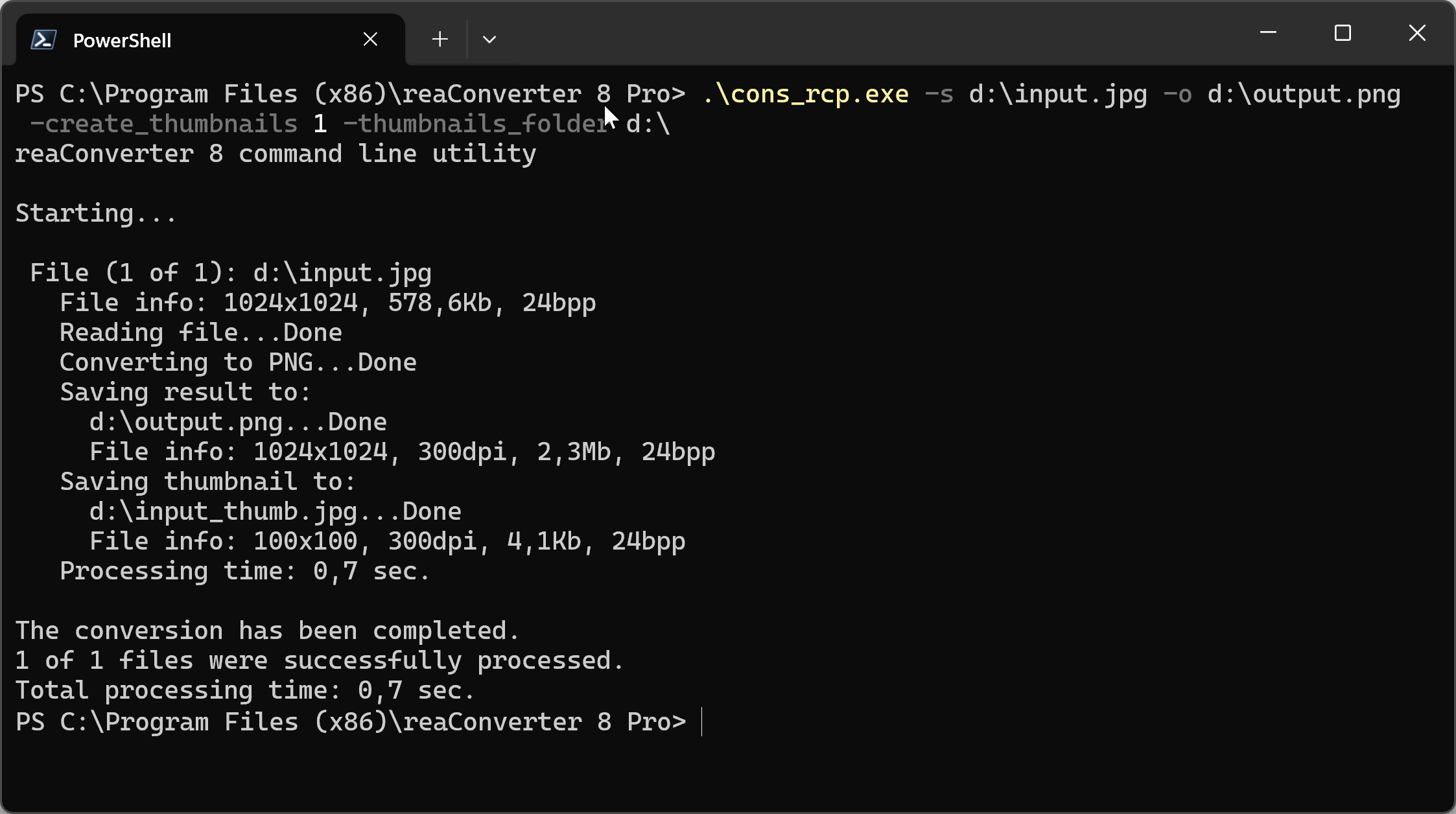 You can make tumbnails using command-line interface, either manually or through automated scripts. reaConverter Pro includes a command-line tool called cons_rcp.exe — an advanced feature designed for professional use, available exclusively in the Pro edition.
