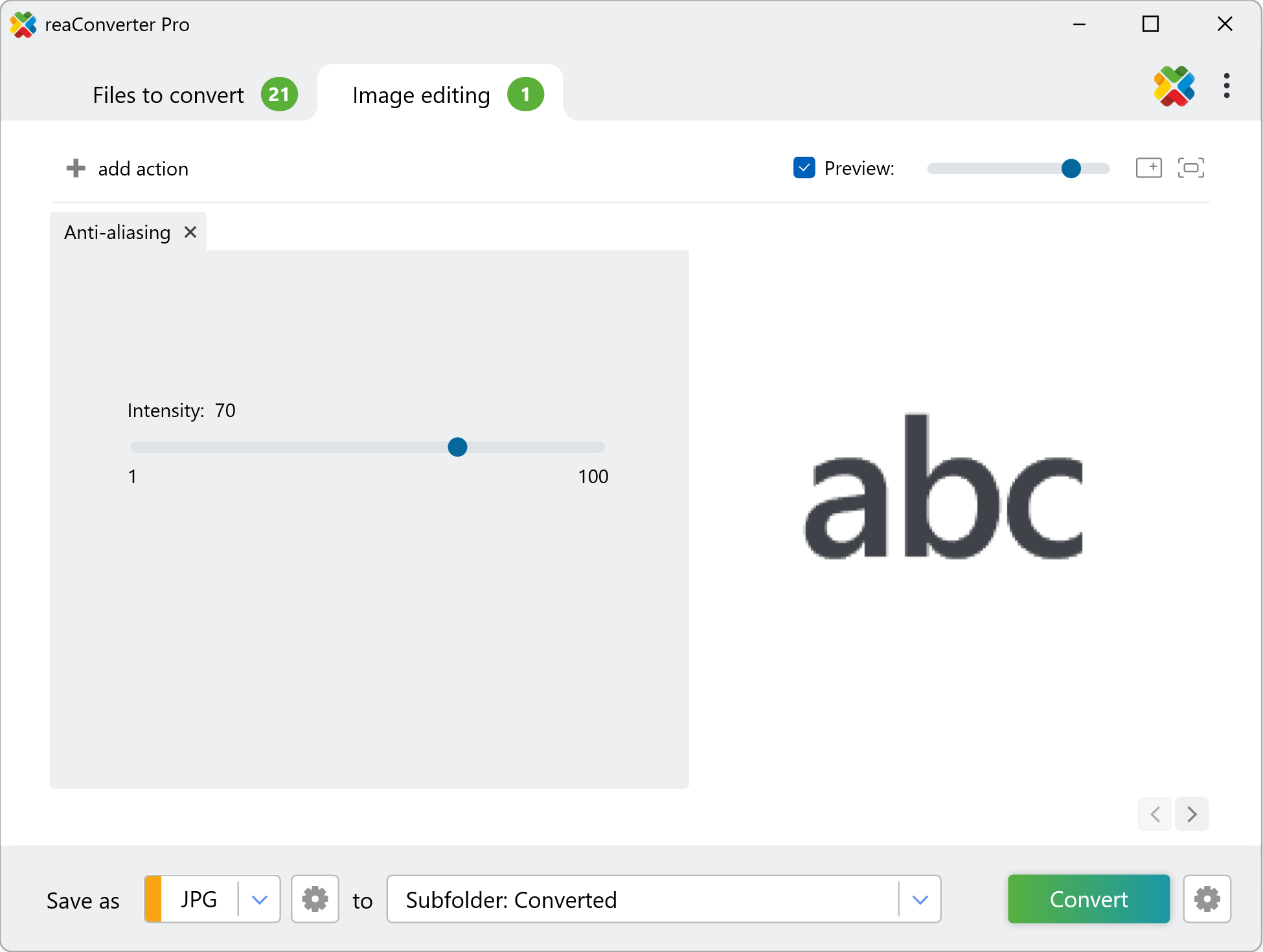 The fast and easy way to apply anti-aliasing on your PC is to use reaConverter. The software runs completely offline, keeping your files safe and private.