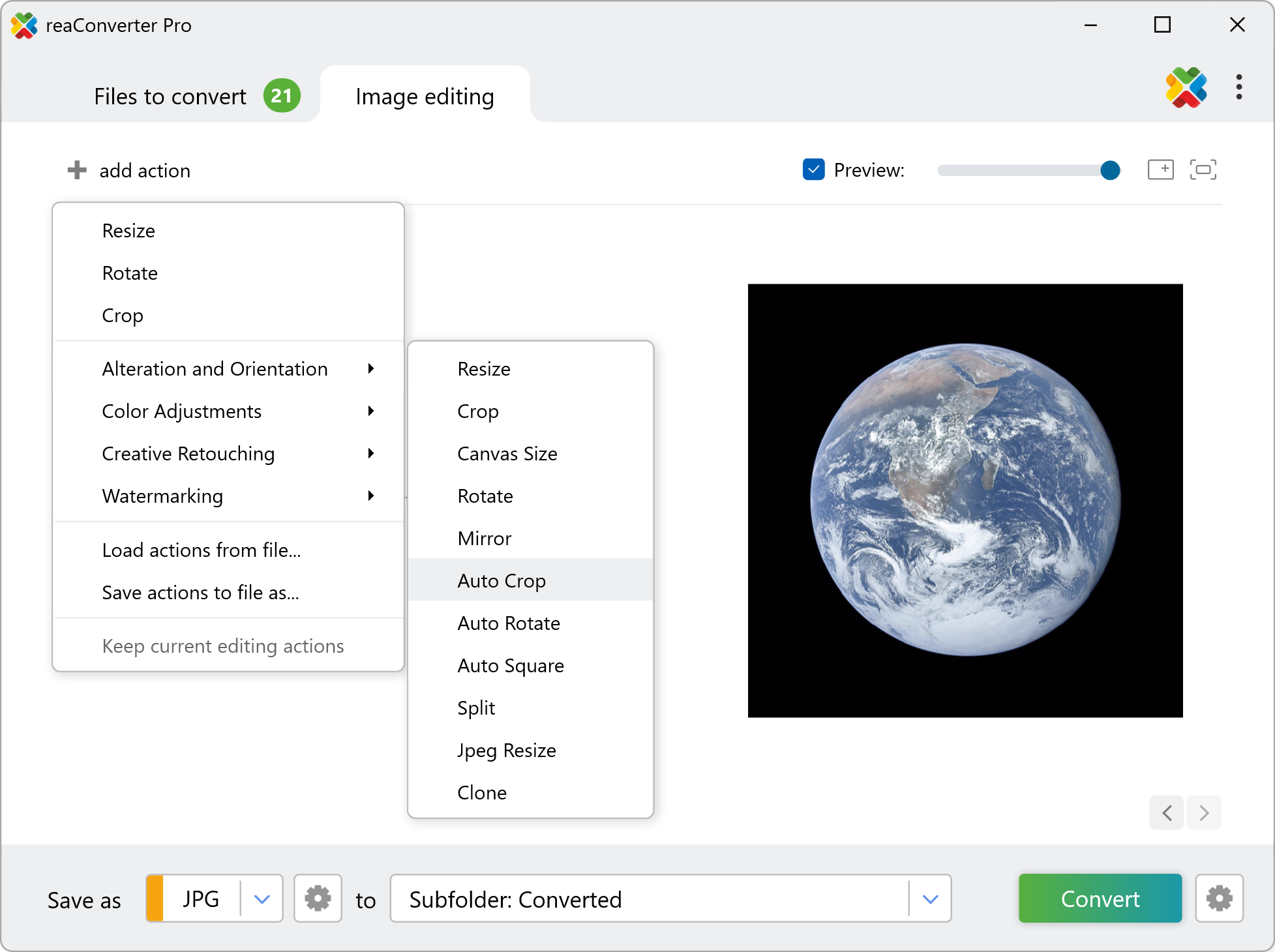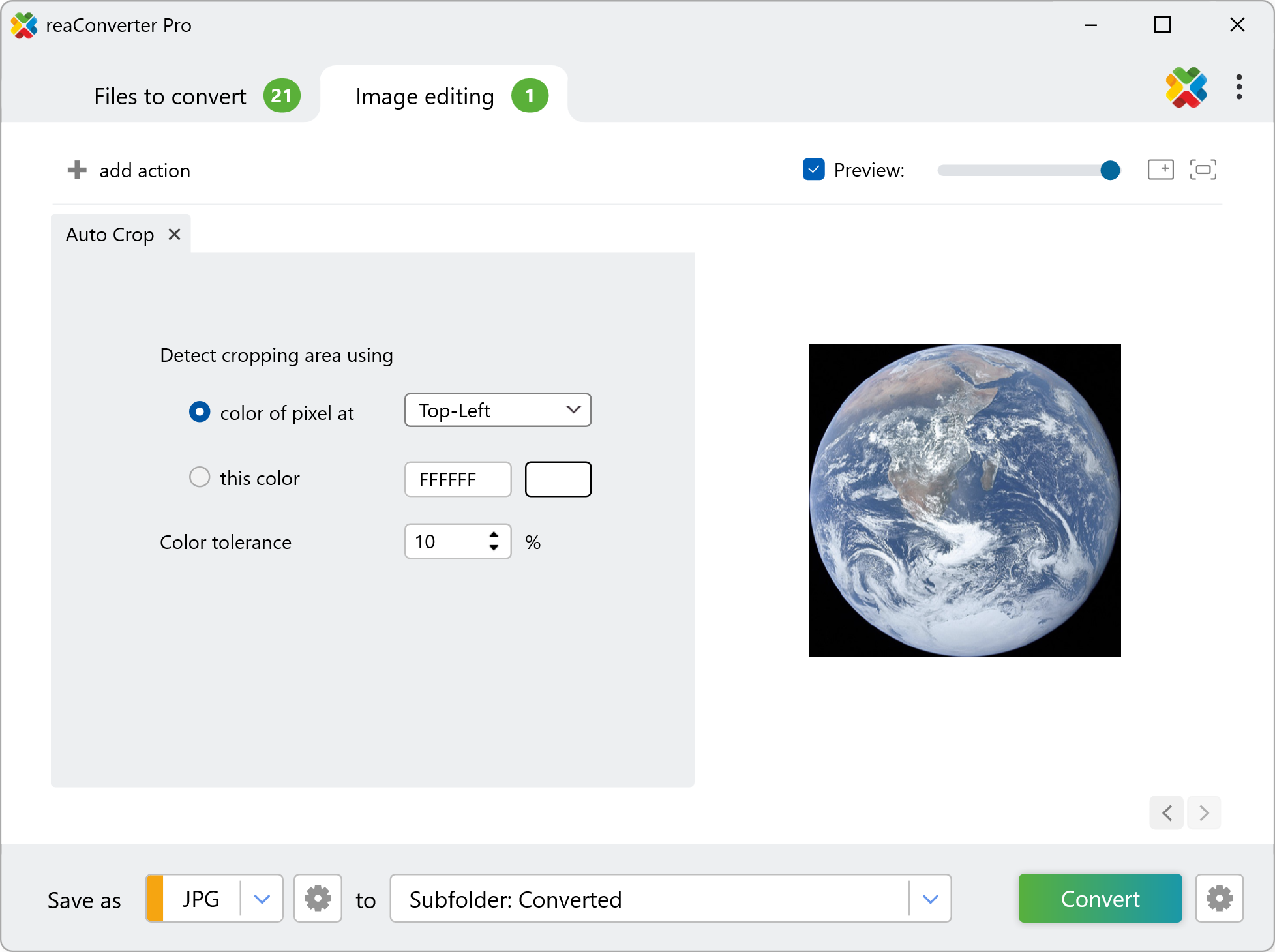 The fast and easy way to auto crop files on your PC is to use reaConverter. The software runs completely offline, keeping your files safe and private.