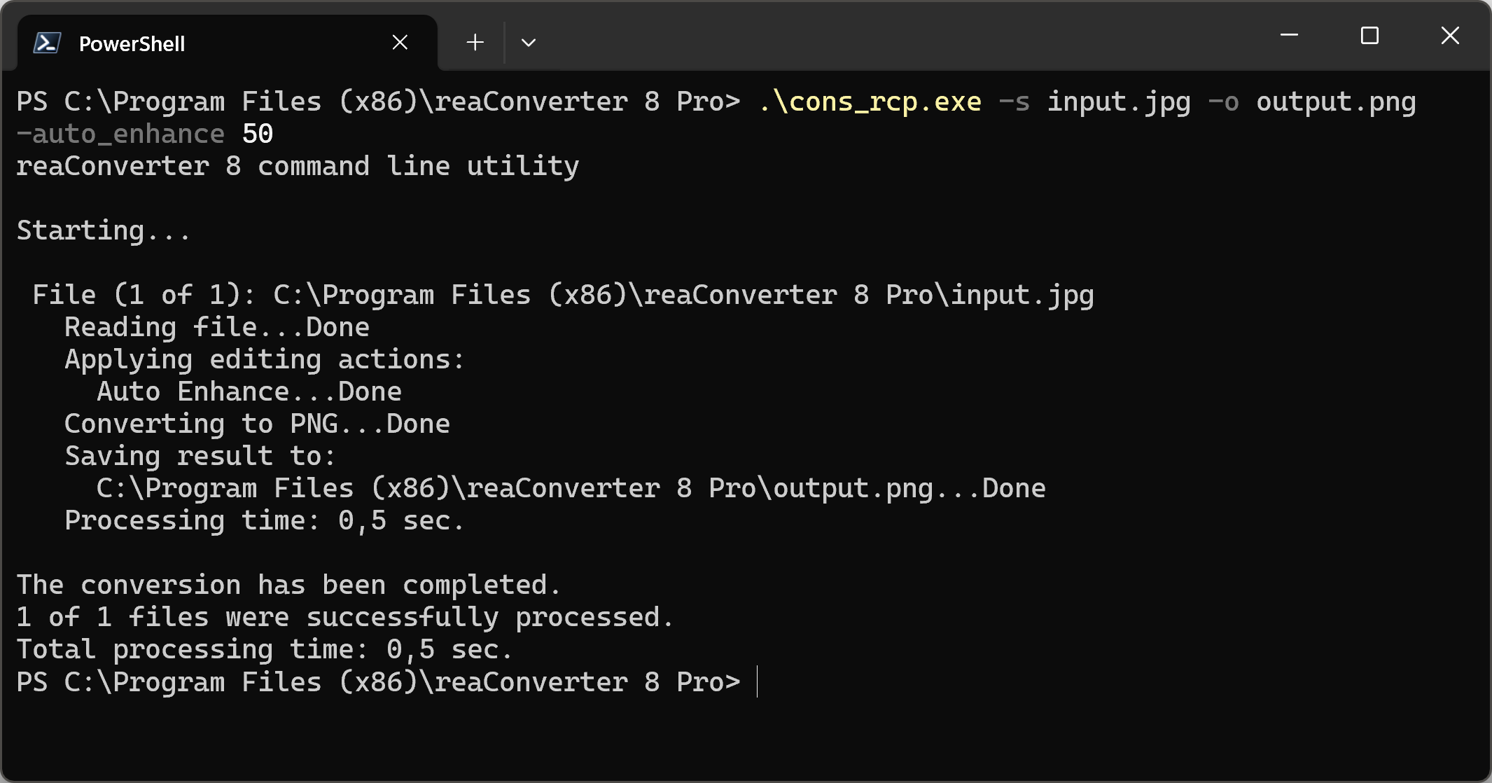 You can also enhance pictures with command-line, either manually or through automated scripts. reaConverter Pro includes a command-line tool called cons_rcp.exe — an advanced feature designed for professional use, available exclusively in the Pro edition.