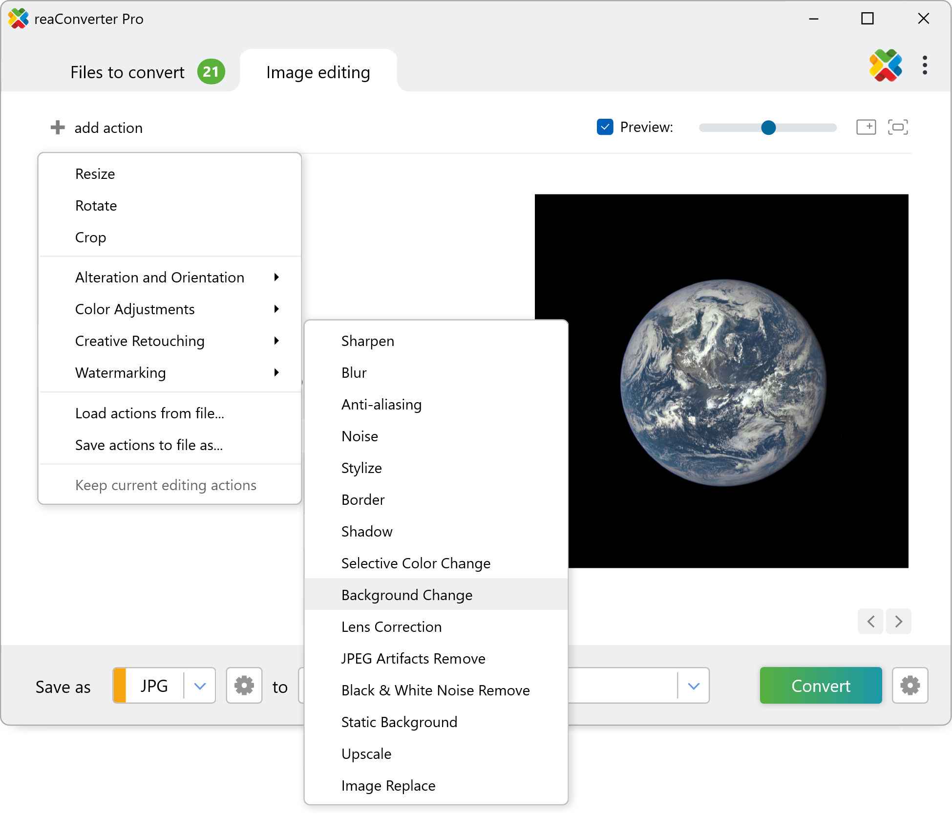 Load one or more images you intend to edit, using reaConverter's handy drag-and-drop feature or by selecting them manually. Adding entire image folders is also an option, as well as loading images from image list files.