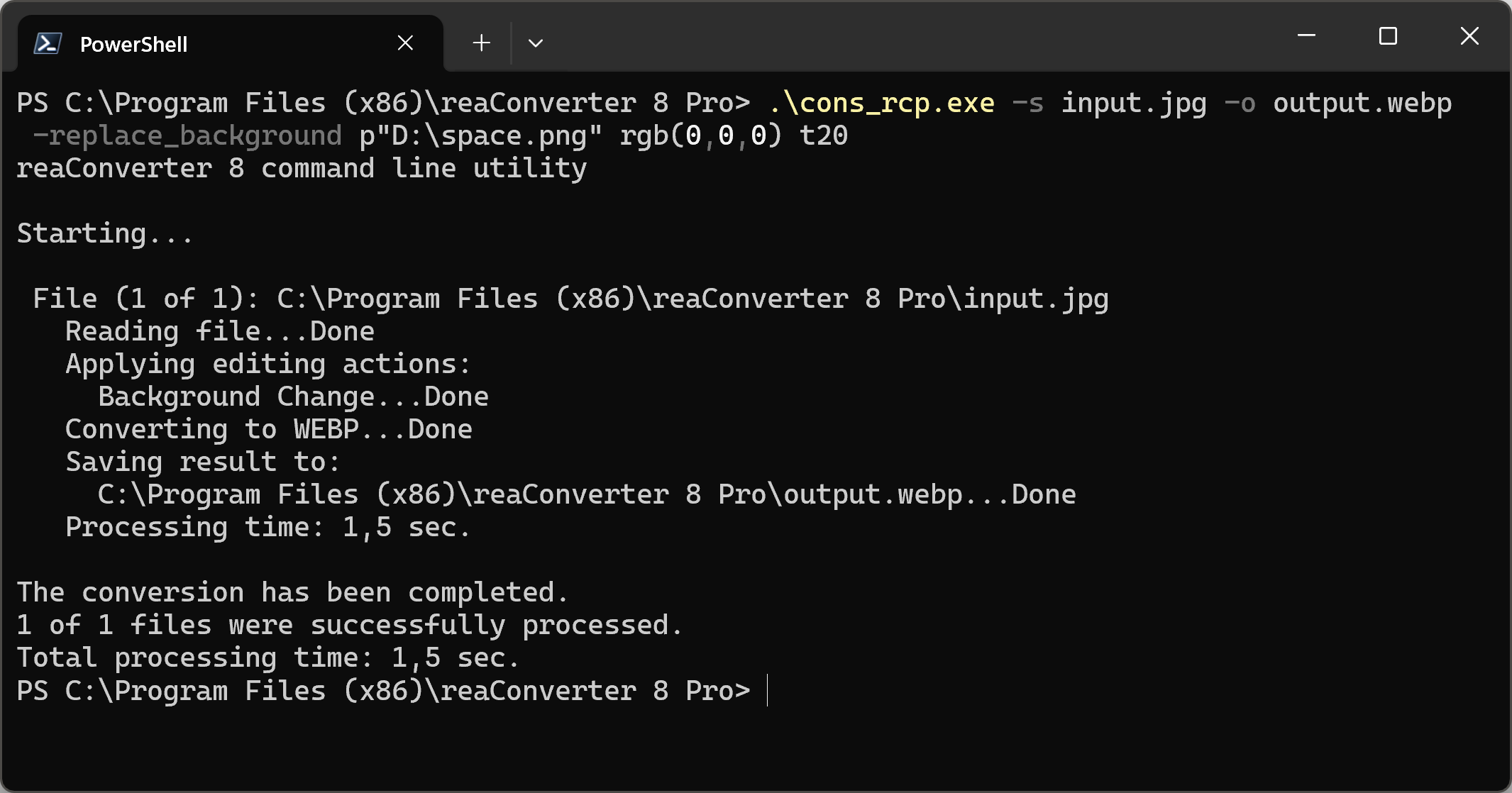 You can also change image background using command-line interface, either manually or through automated scripts. reaConverter Pro includes a command-line tool called cons_rcp.exe — an advanced feature designed for professional use, available exclusively in the Pro edition.