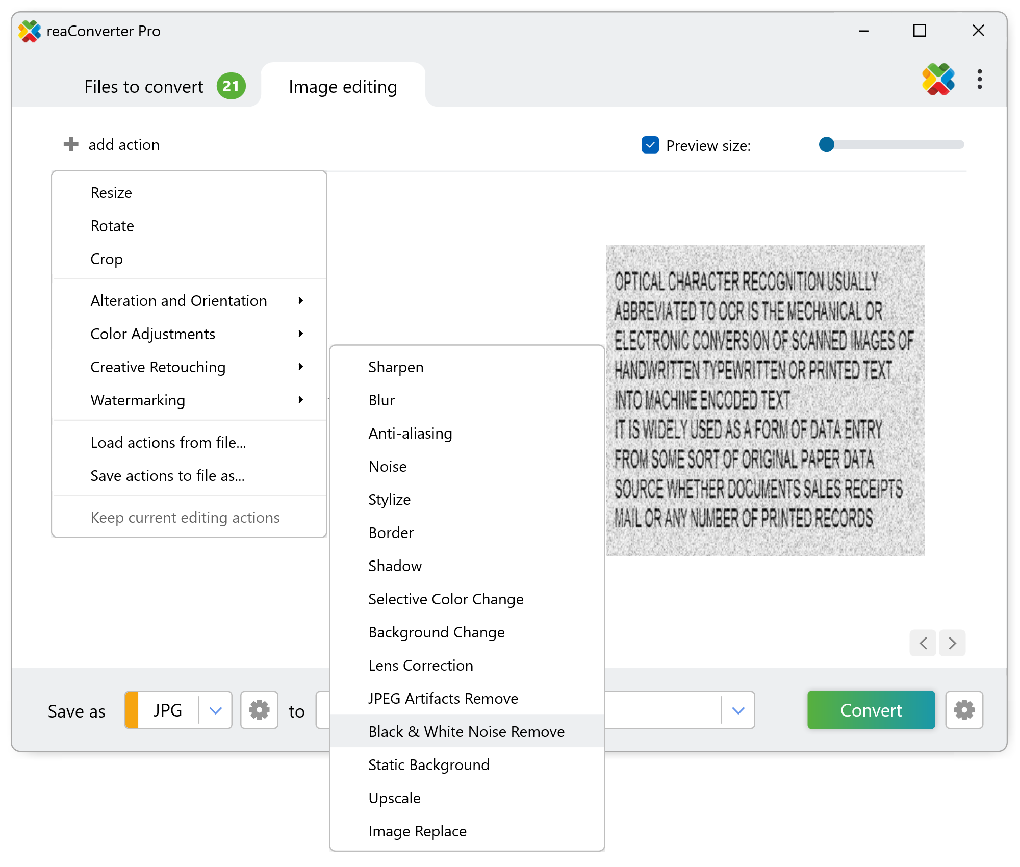 The fast and easy way to remove noise from batch of documents is to use reaConverter. The software runs completely offline, keeping your files safe and private.