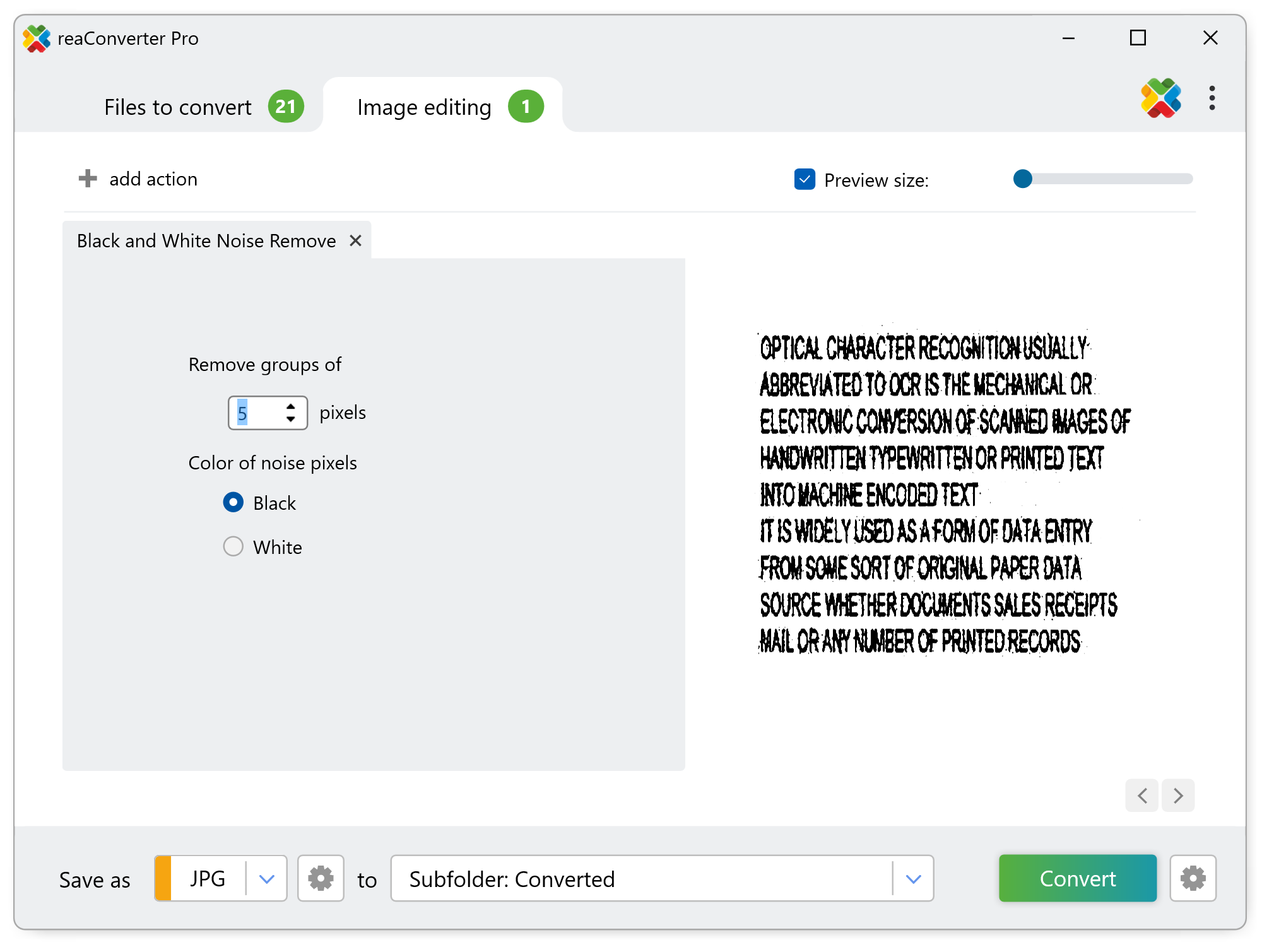 Here you can define the color of the noise pixels and opt for removing groups of a customized numbers of pixels. The real time results of the image editing applied using this feature can be checked in the right part of the window, by ticking the Preview button.