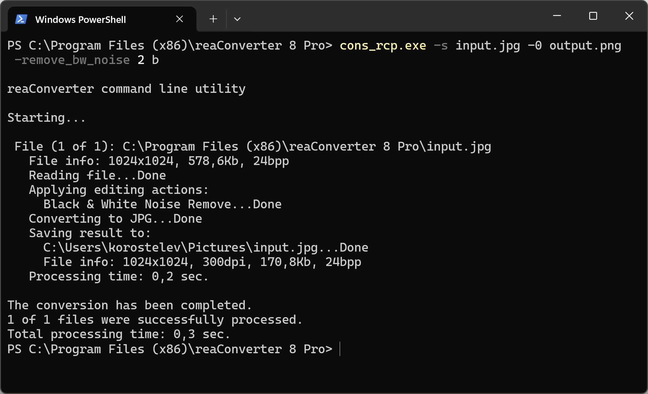 You can also remove noise with command-line interface, either manually or through automated scripts. reaConverter Pro includes a command-line tool called cons_rcp.exe — an advanced feature designed for professional use, available exclusively in the Pro edition.