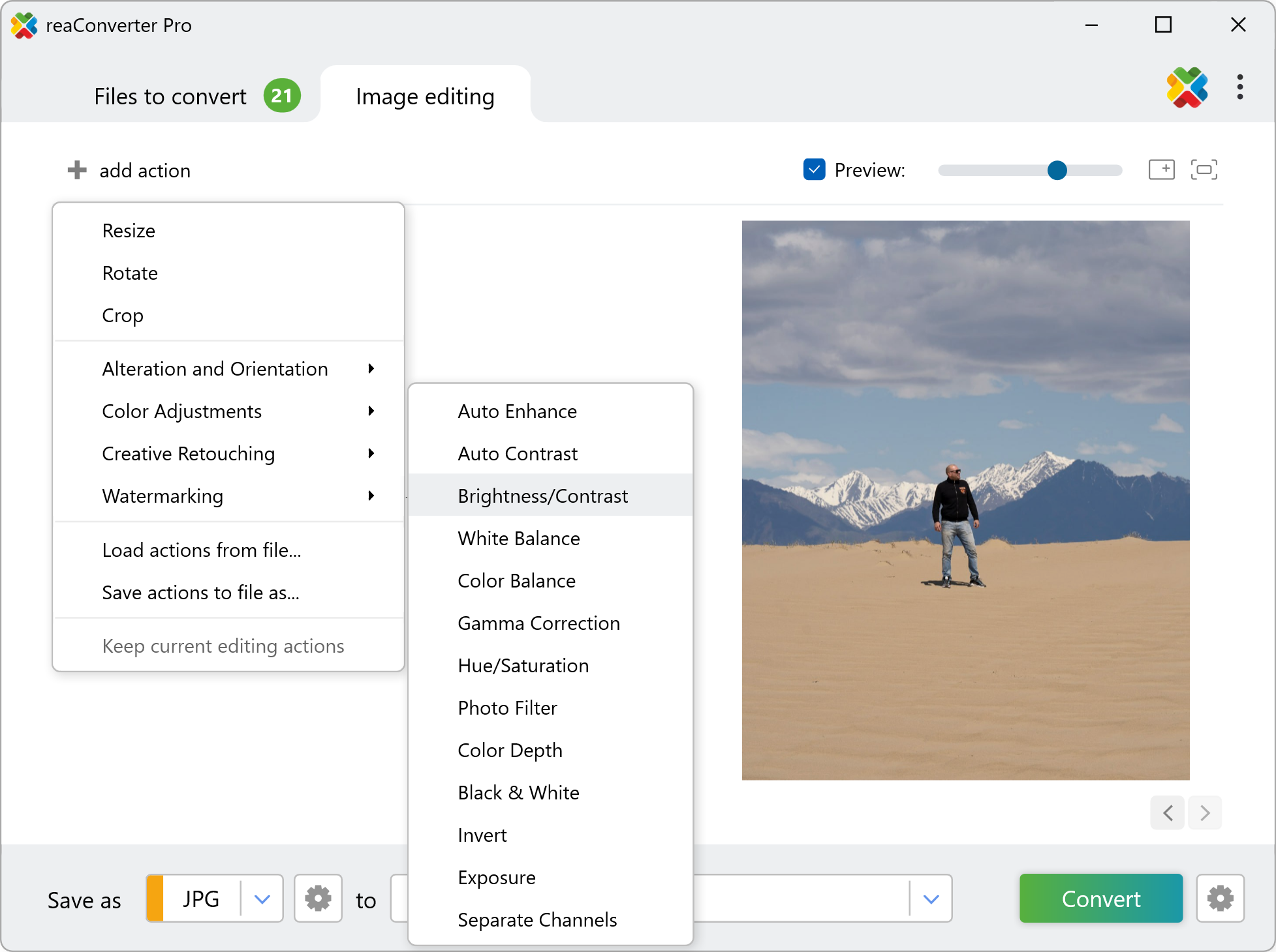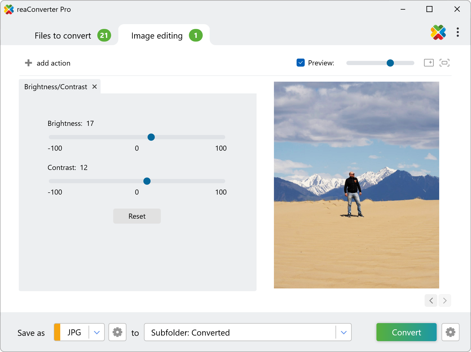 The fast and easy way to edit Brightness/Contrast on your PC is to use reaConverter. The software runs completely offline, keeping your files safe and private.