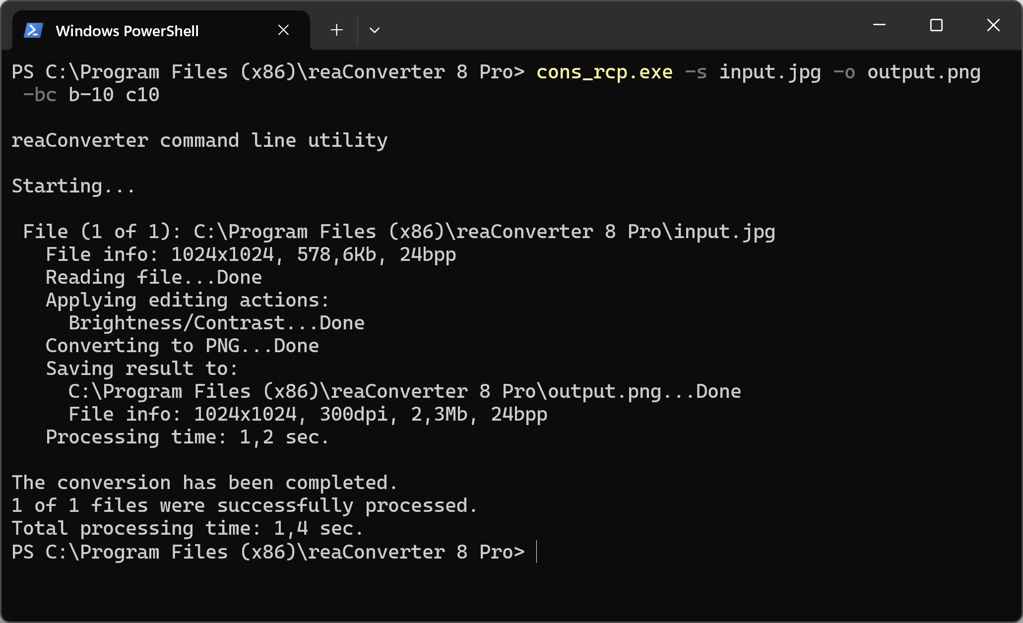 You can also adjust brightness/contrast using command-line tool, either manually or through automated scripts. reaConverter Pro includes a command-line tool called cons_rcp.exe — an advanced feature designed for professional use, available exclusively in the Pro edition.