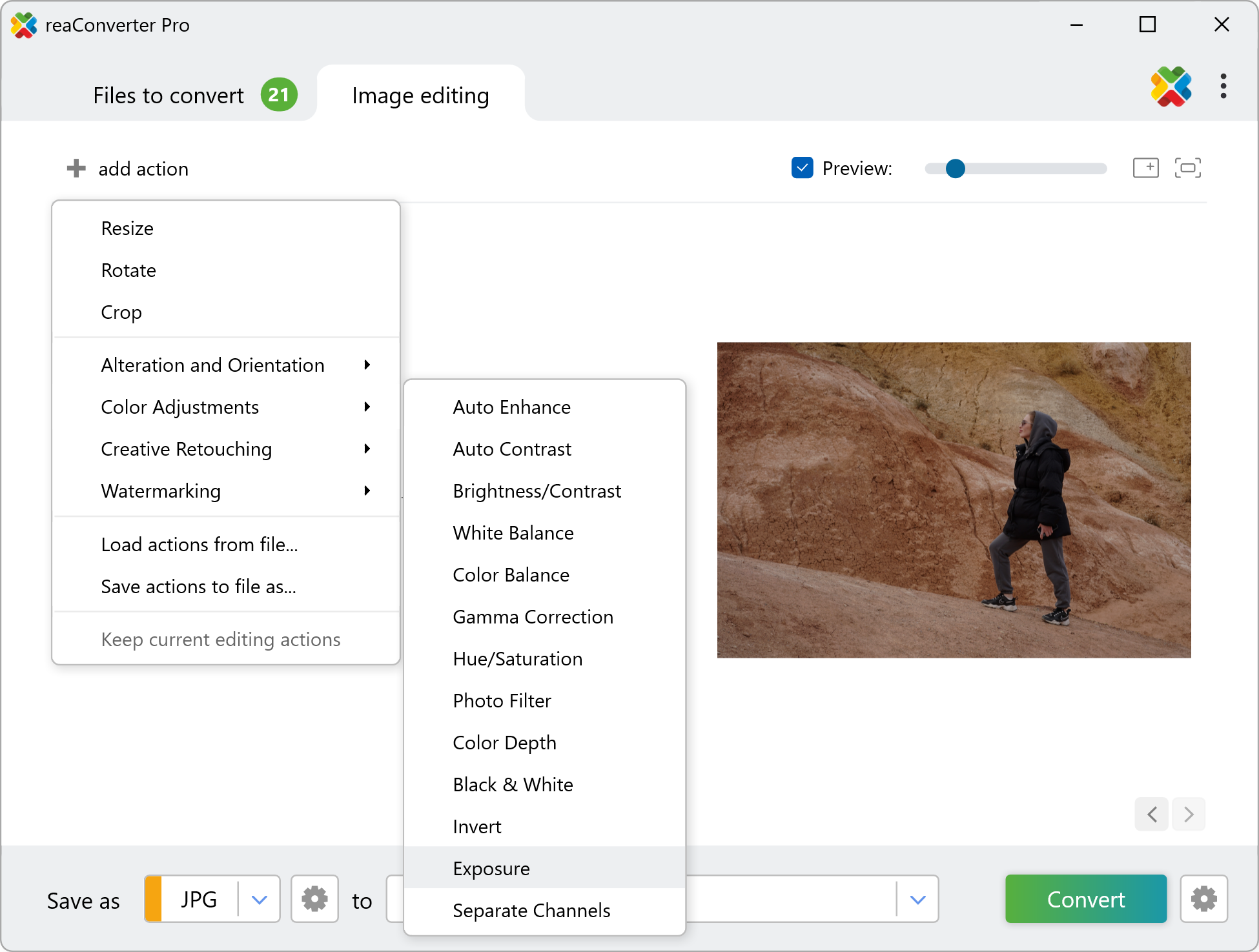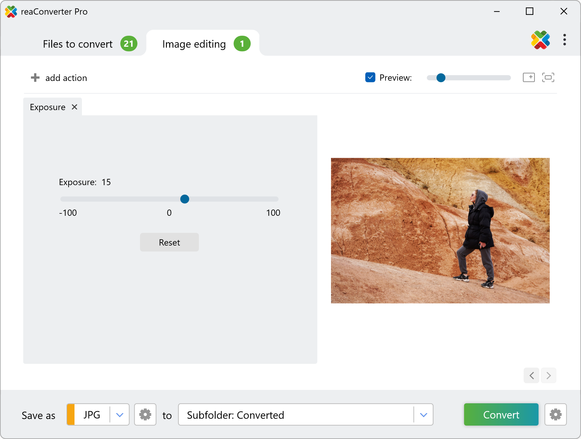 The fast and easy way to adjust exposure on your PC is to use reaConverter. The software runs completely offline, keeping your photos safe and private.