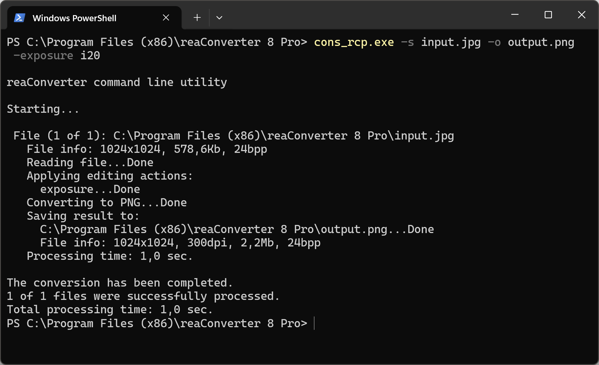 You can also change exposure with command-line interface, either manually or through automated scripts. reaConverter Pro includes a command-line tool called cons_rcp.exe — an advanced feature designed for professional use, available exclusively in the Pro edition.