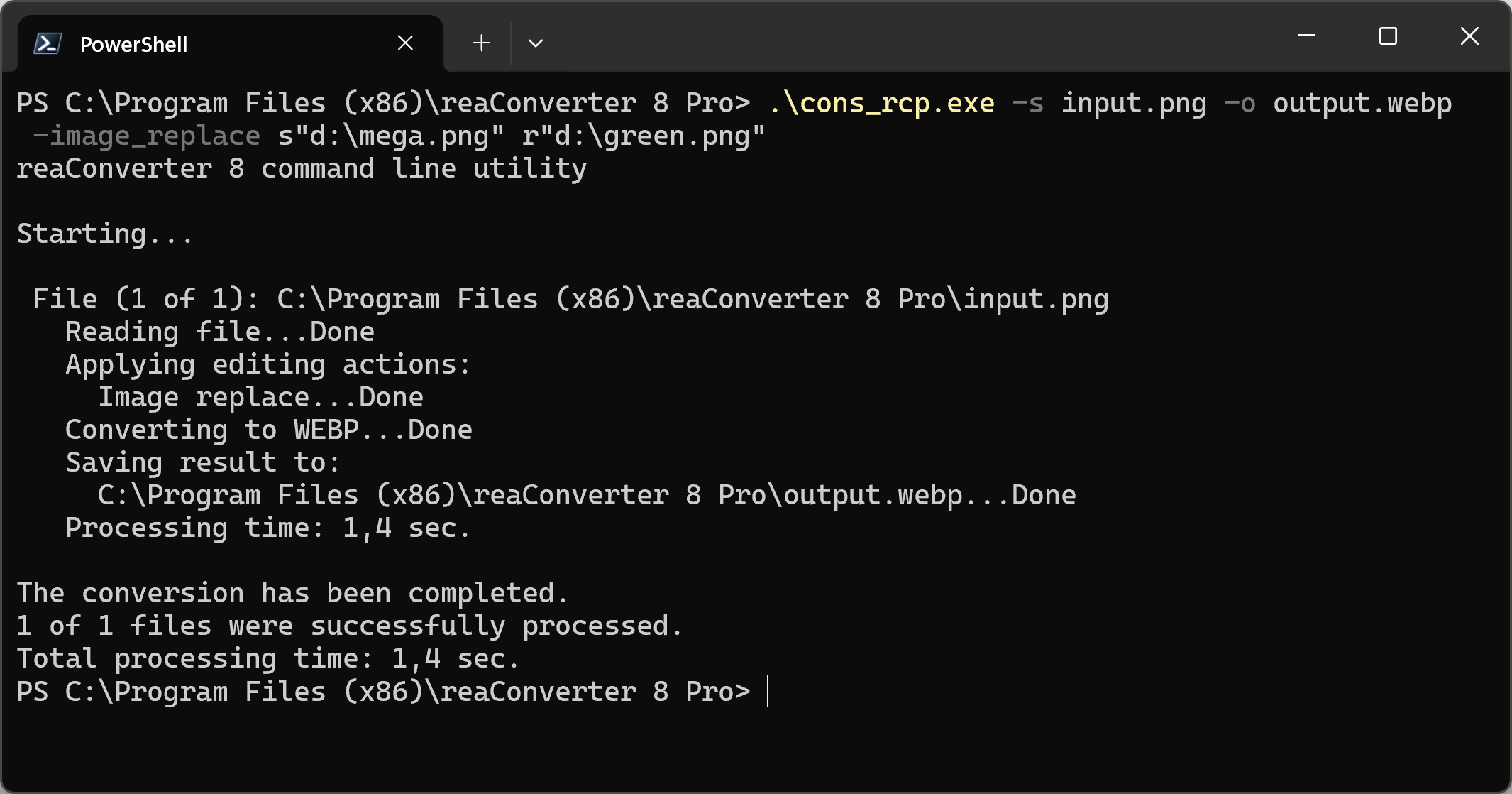 You can also replace image part using command-line interface, either manually or through automated scripts. reaConverter Pro includes a command-line tool called cons_rcp.exe — an advanced feature designed for professional use, available exclusively in the Pro edition.