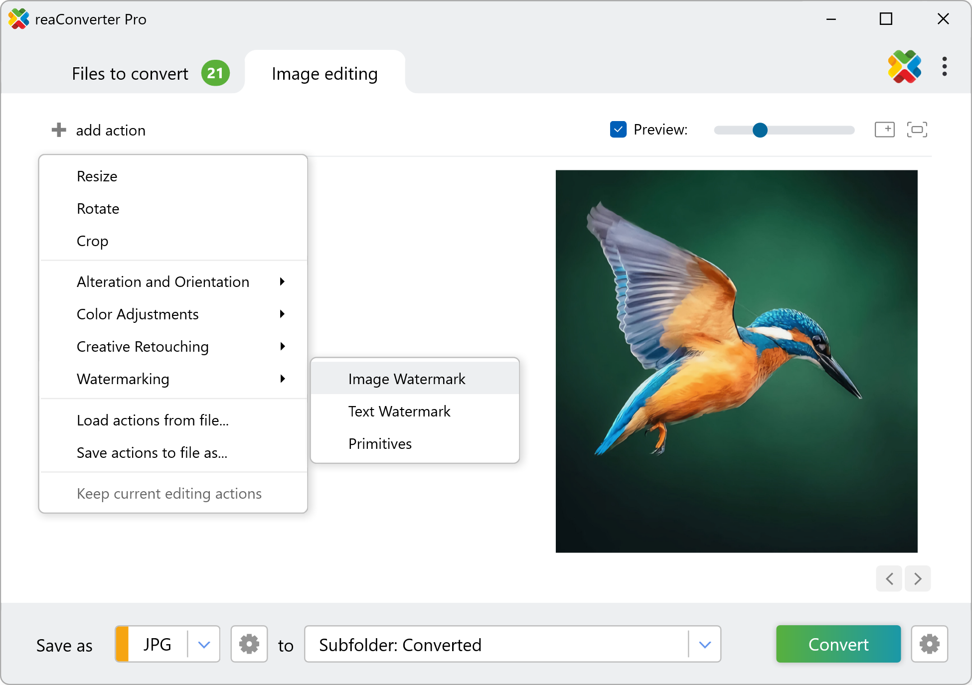 In the Image editing tab, go to Add action → Watermarking → Image Watermark