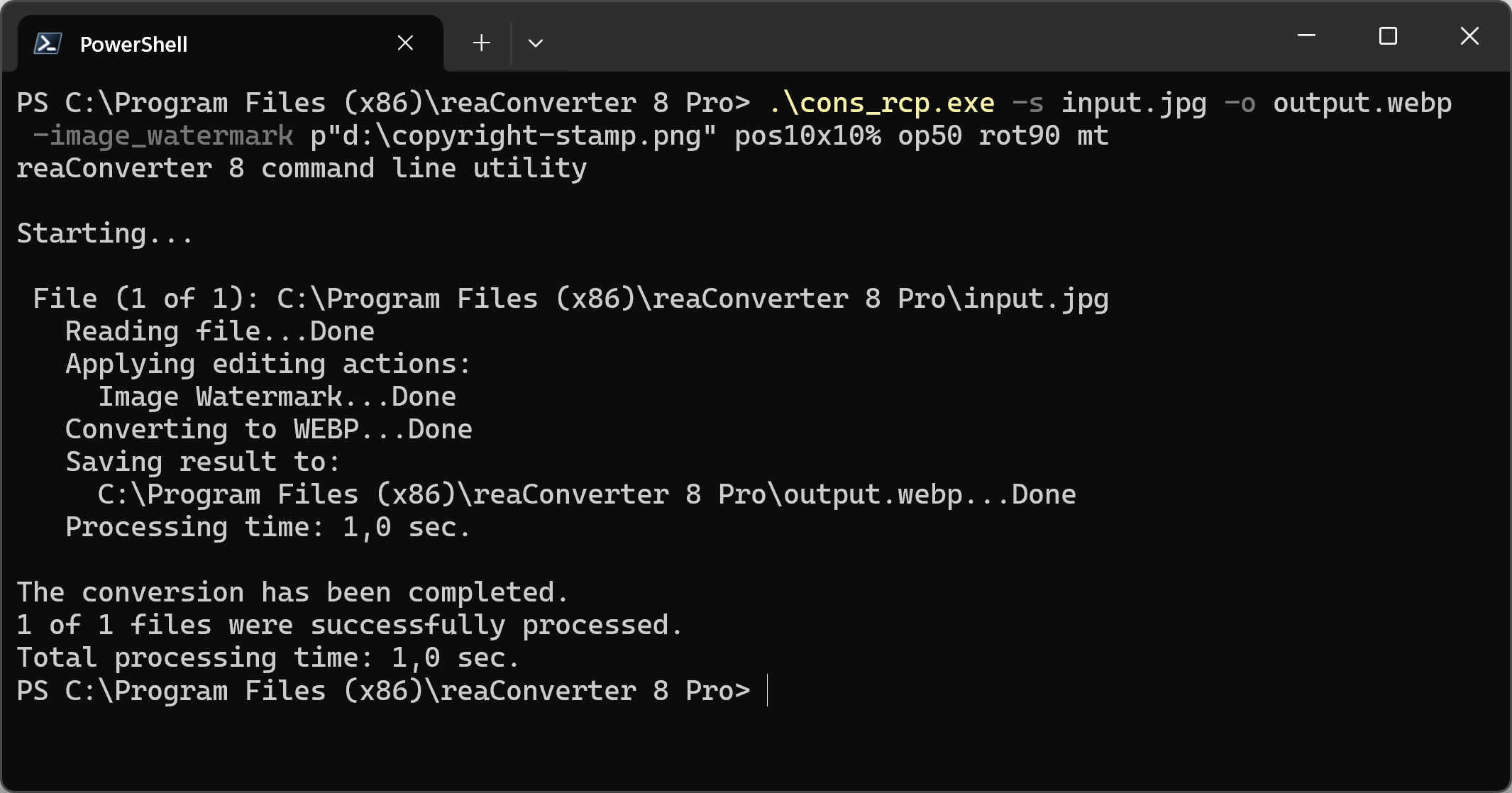 You can also watermark images with command-line , either manually or through automated scripts. reaConverter Pro includes a command-line tool called cons_rcp.exe — an advanced feature designed for professional use, available exclusively in the Pro edition.