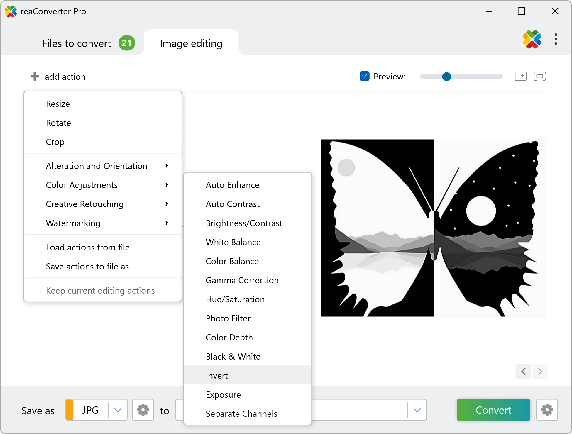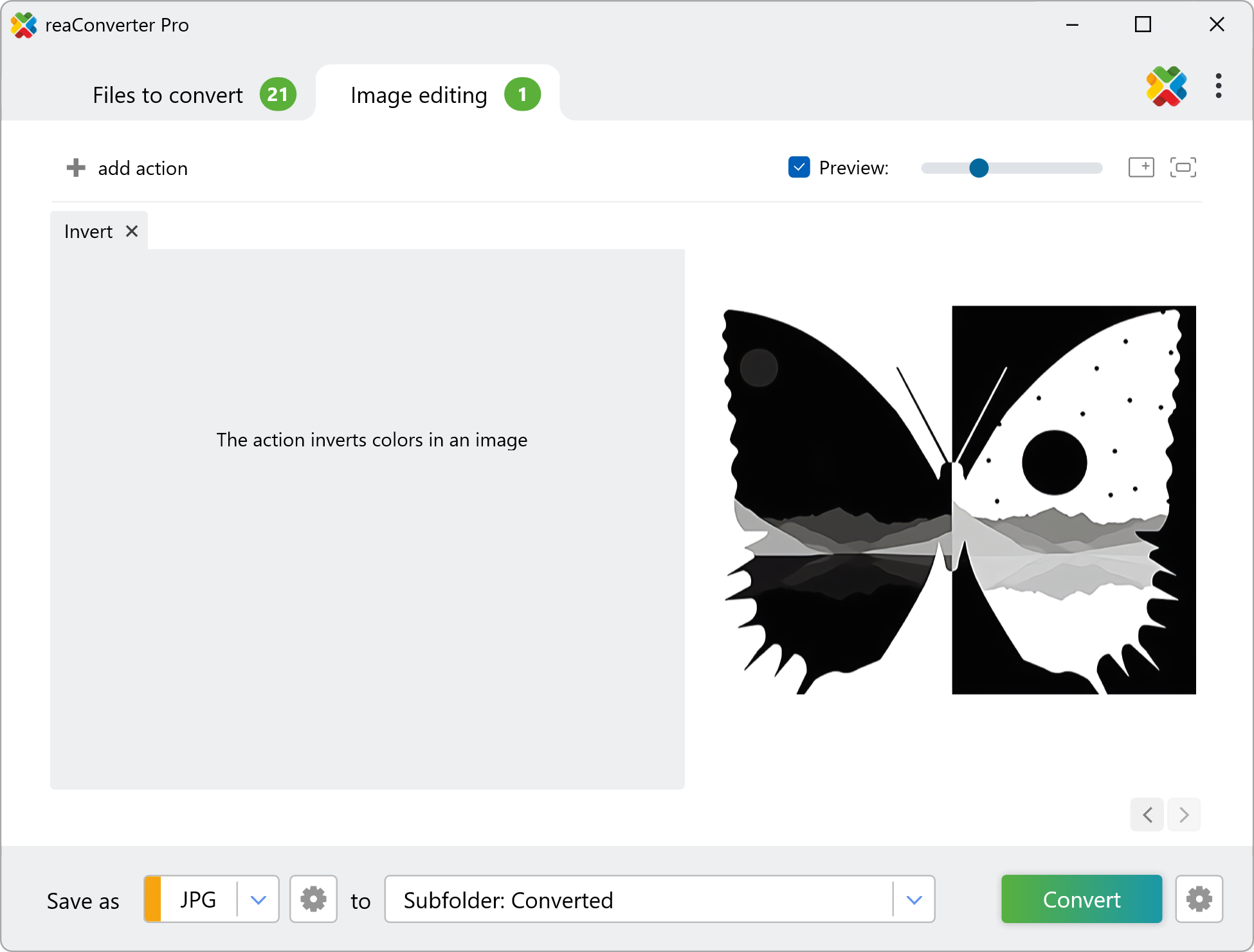 The fast and easy way to invert colors on your PC is to use reaConverter. The software runs completely offline, keeping your files safe and private.