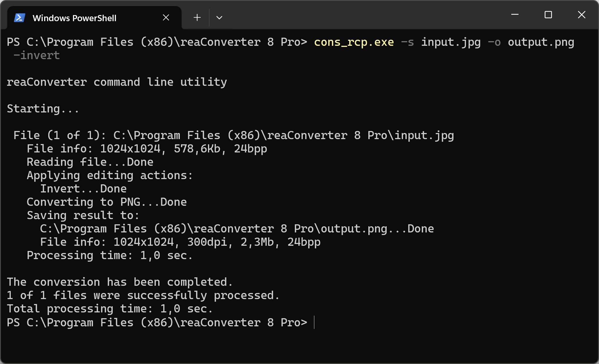 You can also invert images with command-line, either manually or through automated scripts. reaConverter Pro includes a command-line tool called cons_rcp.exe — an advanced feature designed for professional use, available exclusively in the Pro edition.