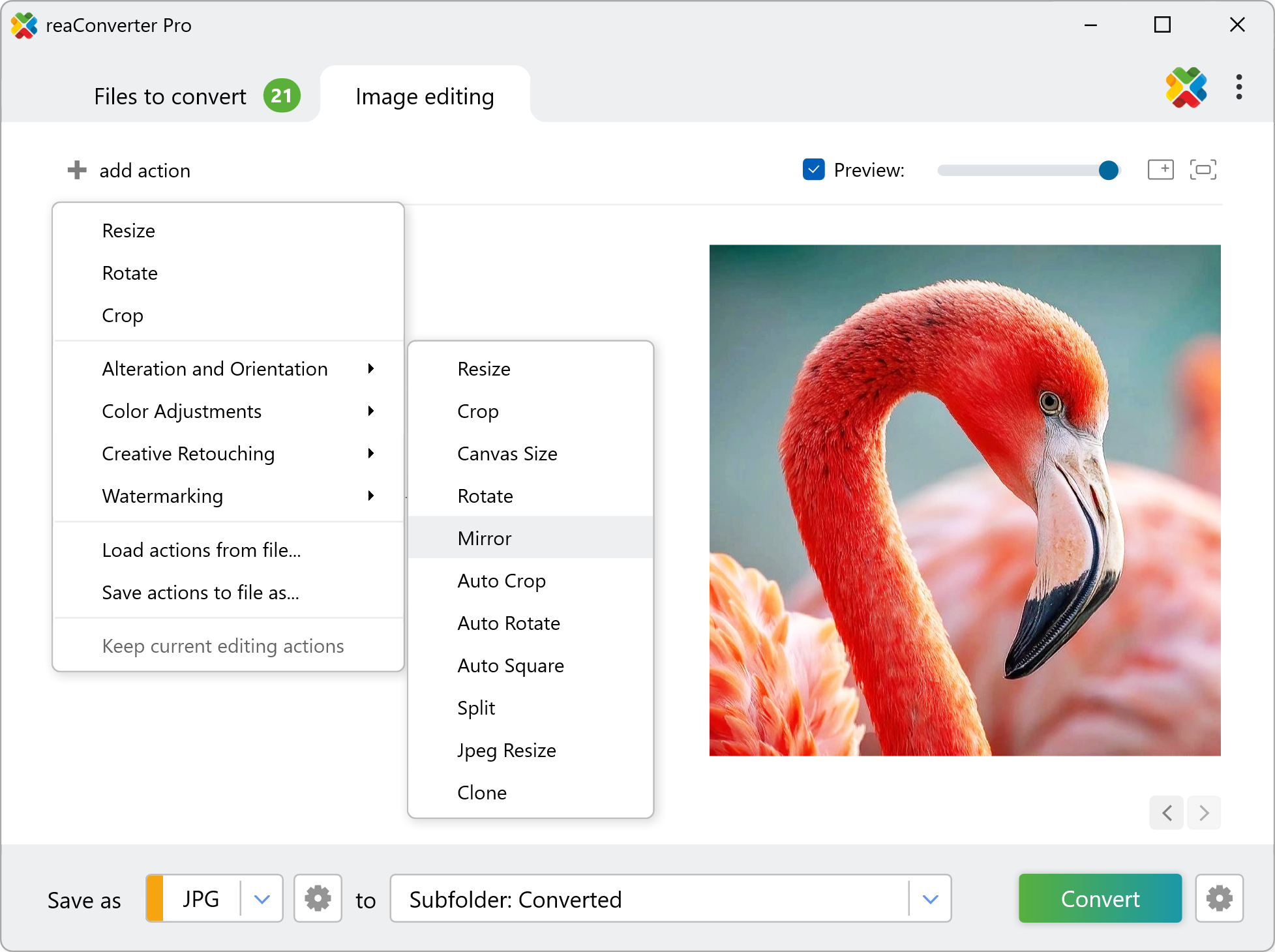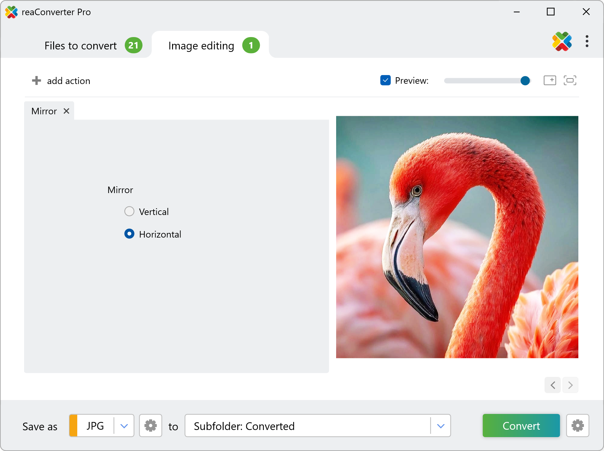 The fast and easy way to mirror images on your PC is to use reaConverter. The software runs completely offline, keeping your files safe and private.