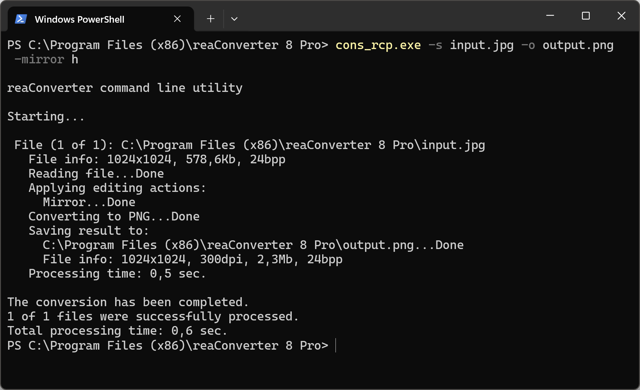 You can also flip images using command-line , either manually or through automated scripts. reaConverter Pro includes a command-line tool called cons_rcp.exe — an advanced feature designed for professional use, available exclusively in the Pro edition.