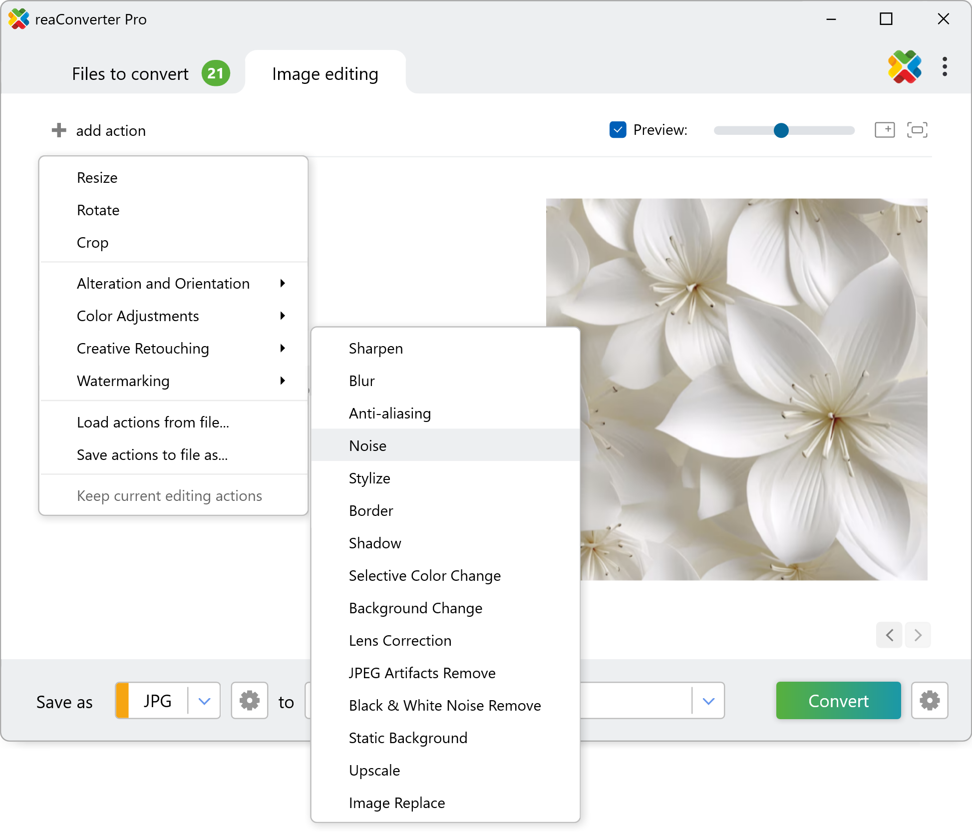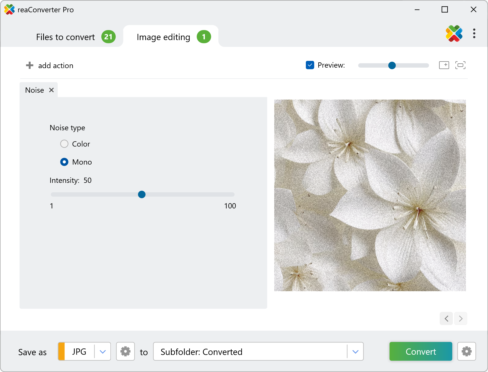 The fast and easy way to noise images on your PC is to use reaConverter. The software runs completely offline, keeping your files safe and private.