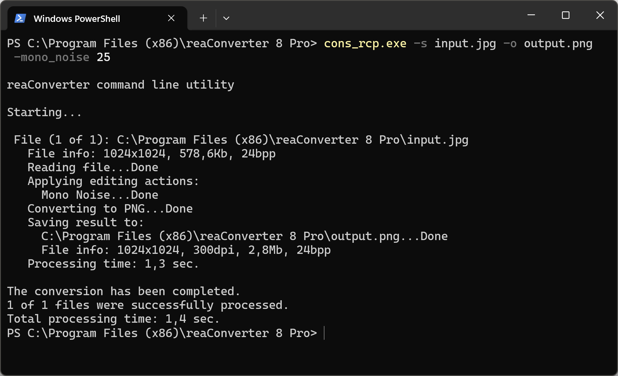 You can also add noise using command-line interface, either manually or through automated scripts. reaConverter Pro includes a command-line tool called cons_rcp.exe — an advanced feature designed for professional use, available exclusively in the Pro edition.