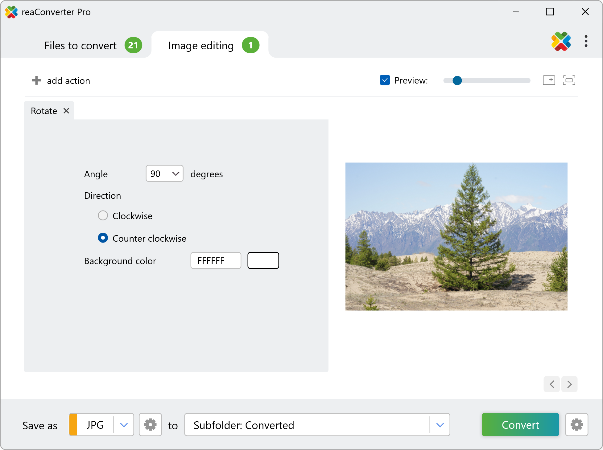 Then decide the angle and direction of rotation with 2 easy clicks. In case you pick a 45 degree angle rotation, reaConverter allows you to customize the background of your new image by using a handy color picker on the preview image.