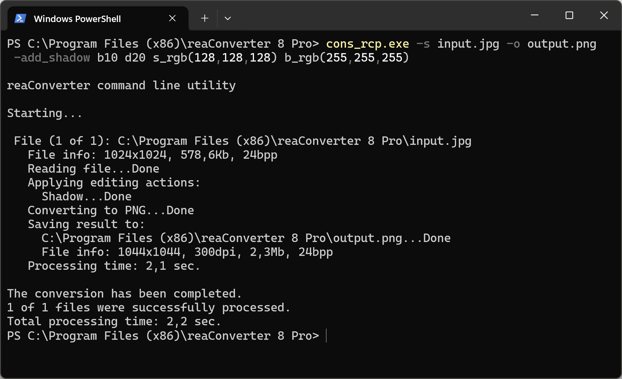You can also add shadow using command-line interface, either manually or through automated scripts. reaConverter Pro includes a command-line tool called cons_rcp.exe — an advanced feature designed for professional use, available exclusively in the Pro edition.