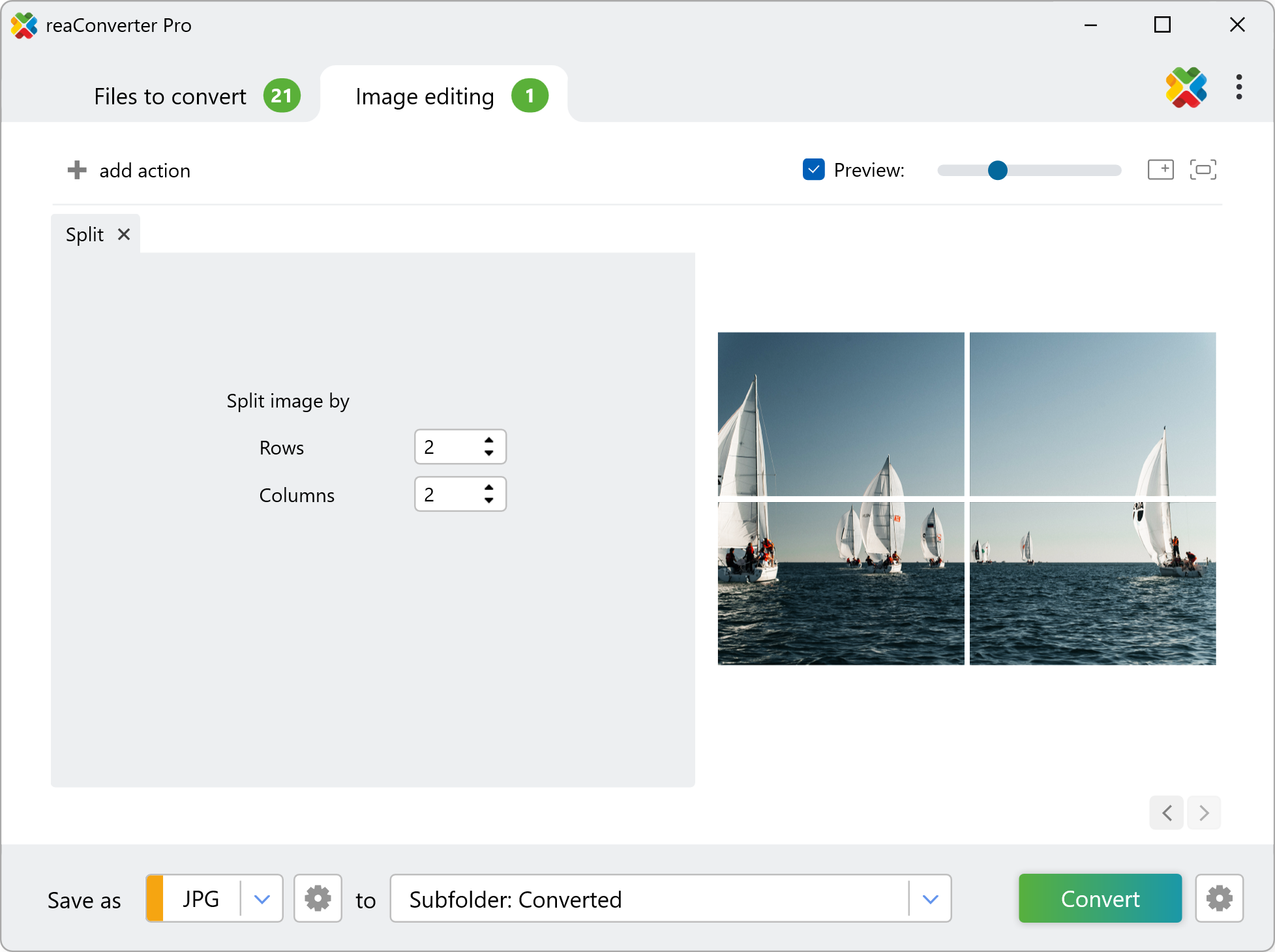 Splitting images is part of a long list of editing features allowing you to do advanced customization of images during conversion. It is also the only one in which you create several output images starting from a single input one.