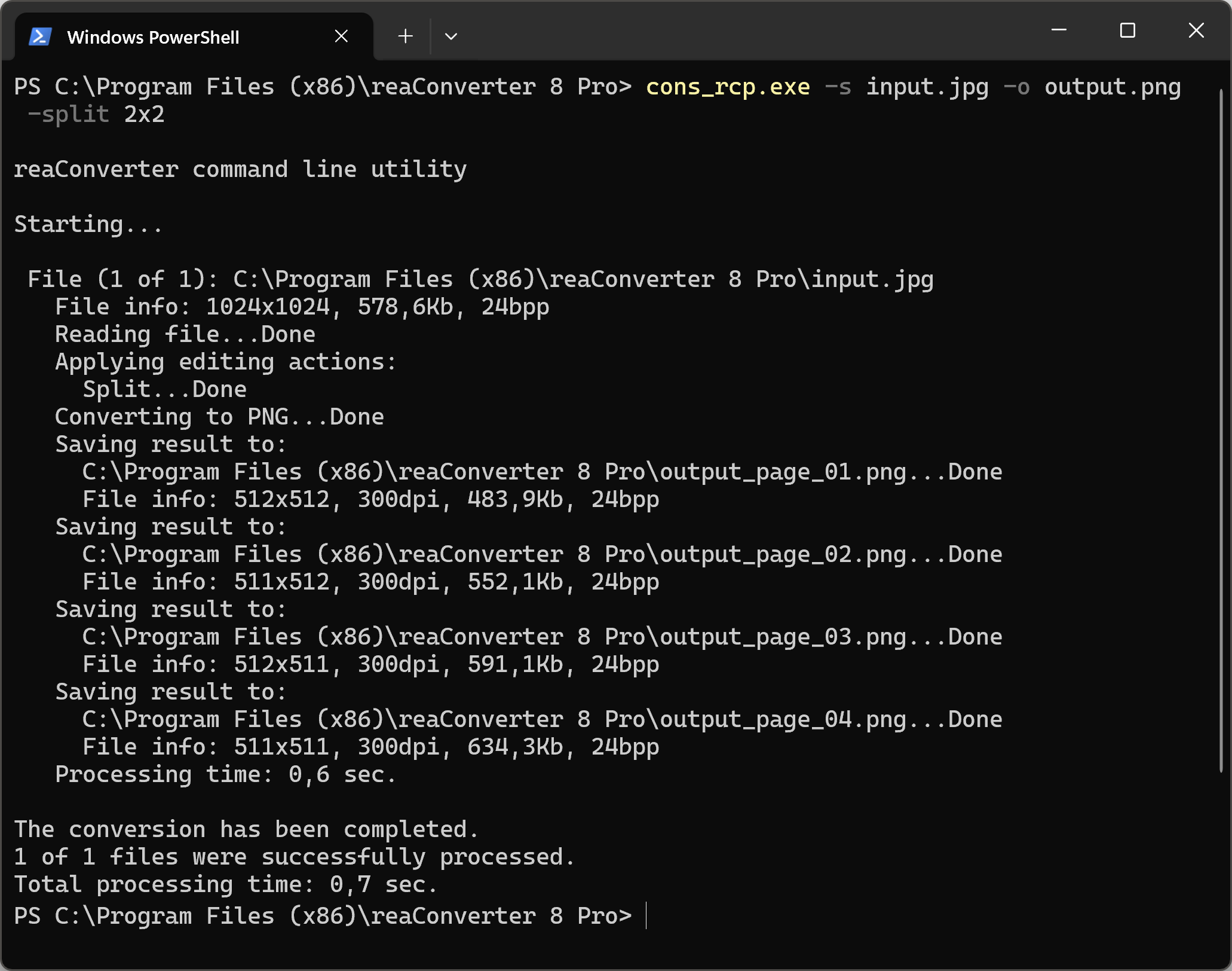 You can also split pictures using command-line interface, either manually or through automated scripts. reaConverter Pro includes a command-line tool called cons_rcp.exe — an advanced feature designed for professional use, available exclusively in the Pro edition.