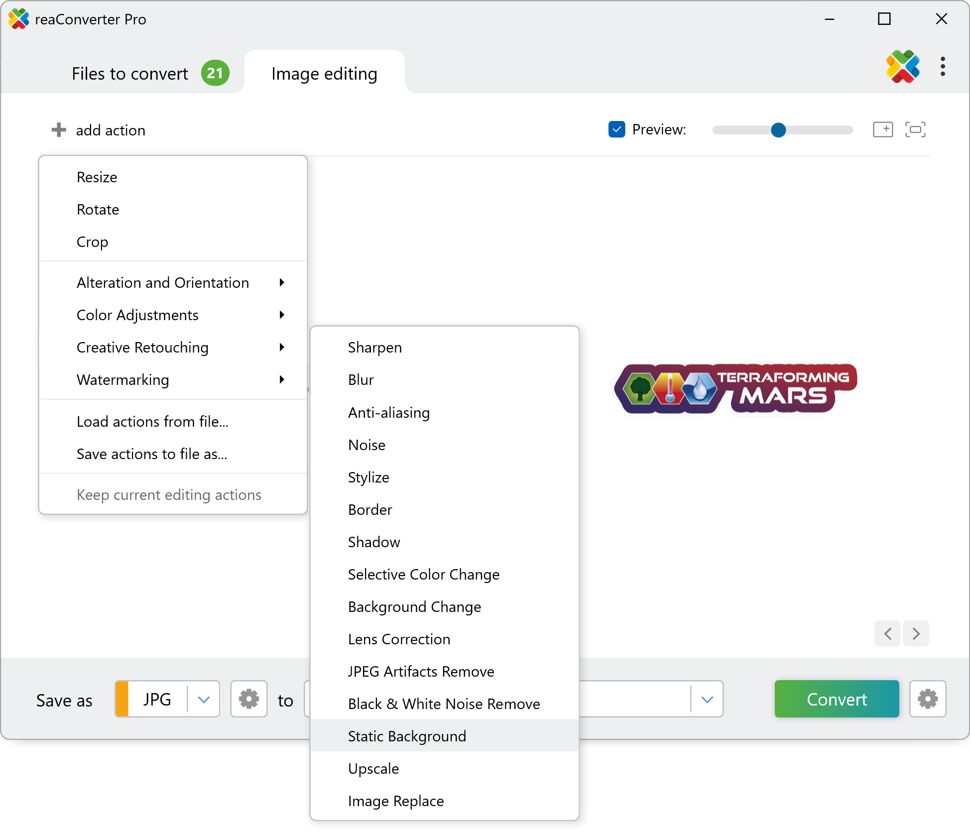 Go to the Image editing tab and click Add action → Creative Retouching → Static Background