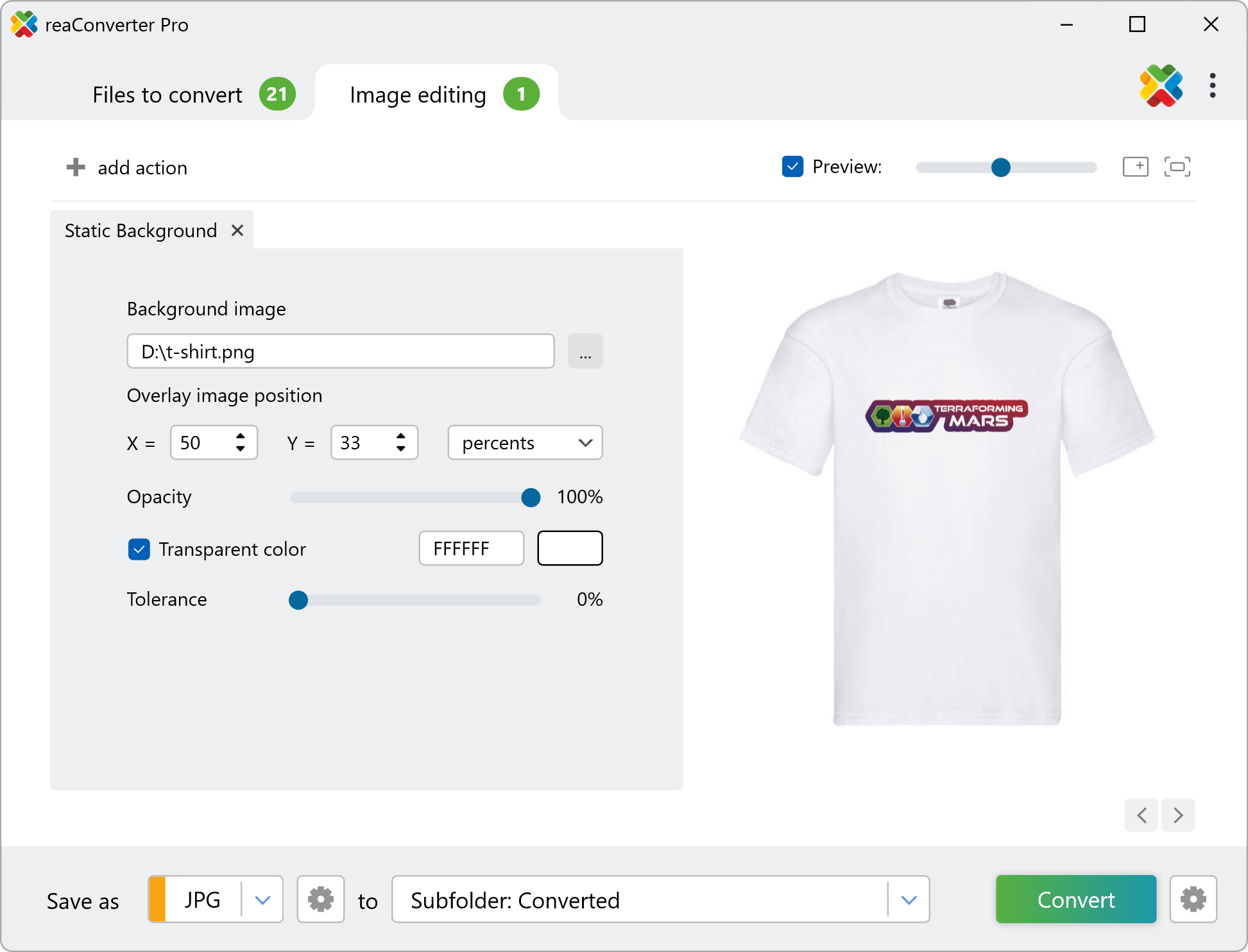 Here you can also position the overlay image by defining its X and Y coordinates. Other available options include customizing the opacity or color intensity of the foreground image and watermarking the transparent color, which allows you to tailor how this image will appear over the static background.