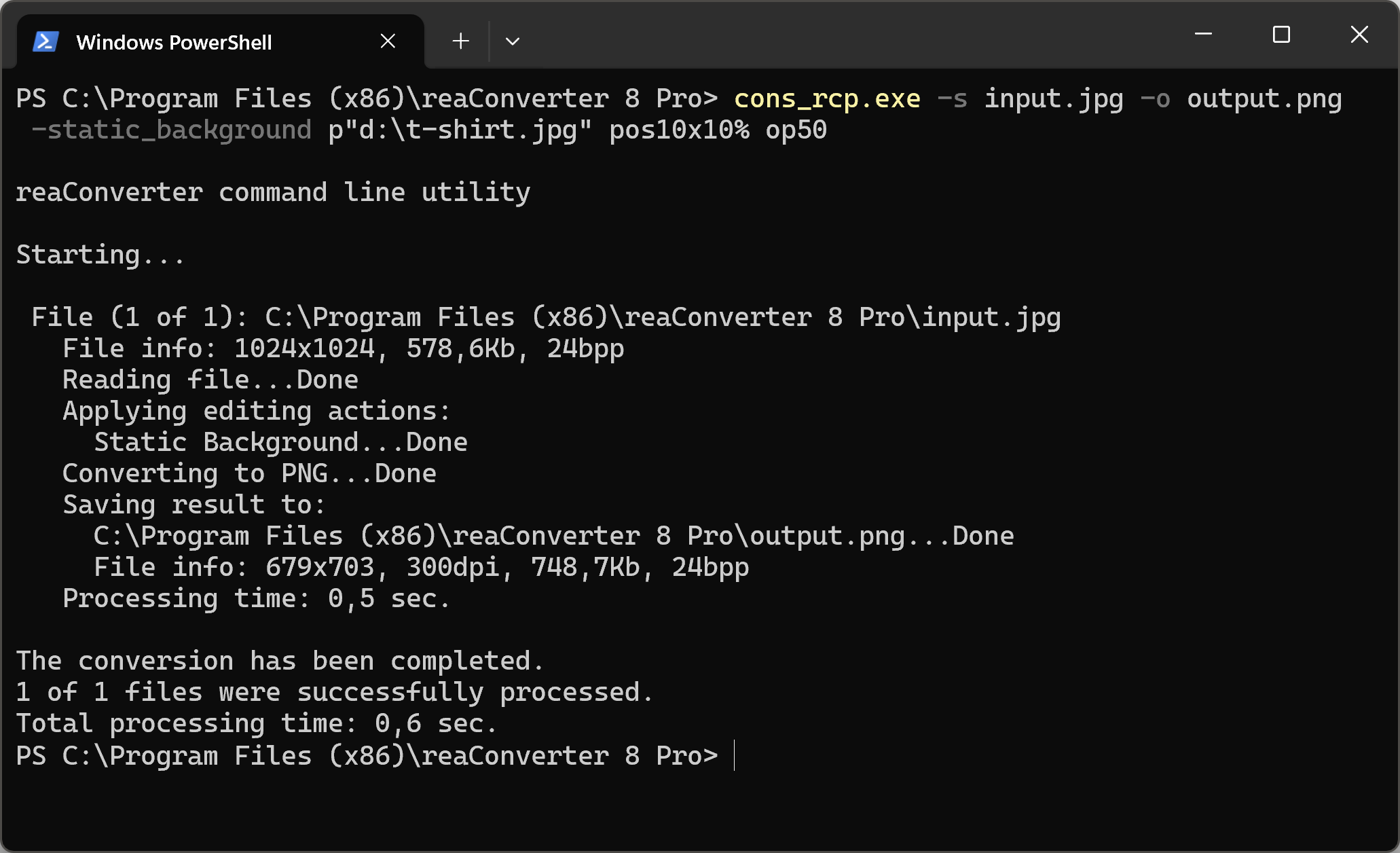 You can also set images on a background using command-line interface, either manually or through automated scripts. reaConverter Pro includes a command-line tool called cons_rcp.exe — an advanced feature designed for professional use, available exclusively in the Pro edition.