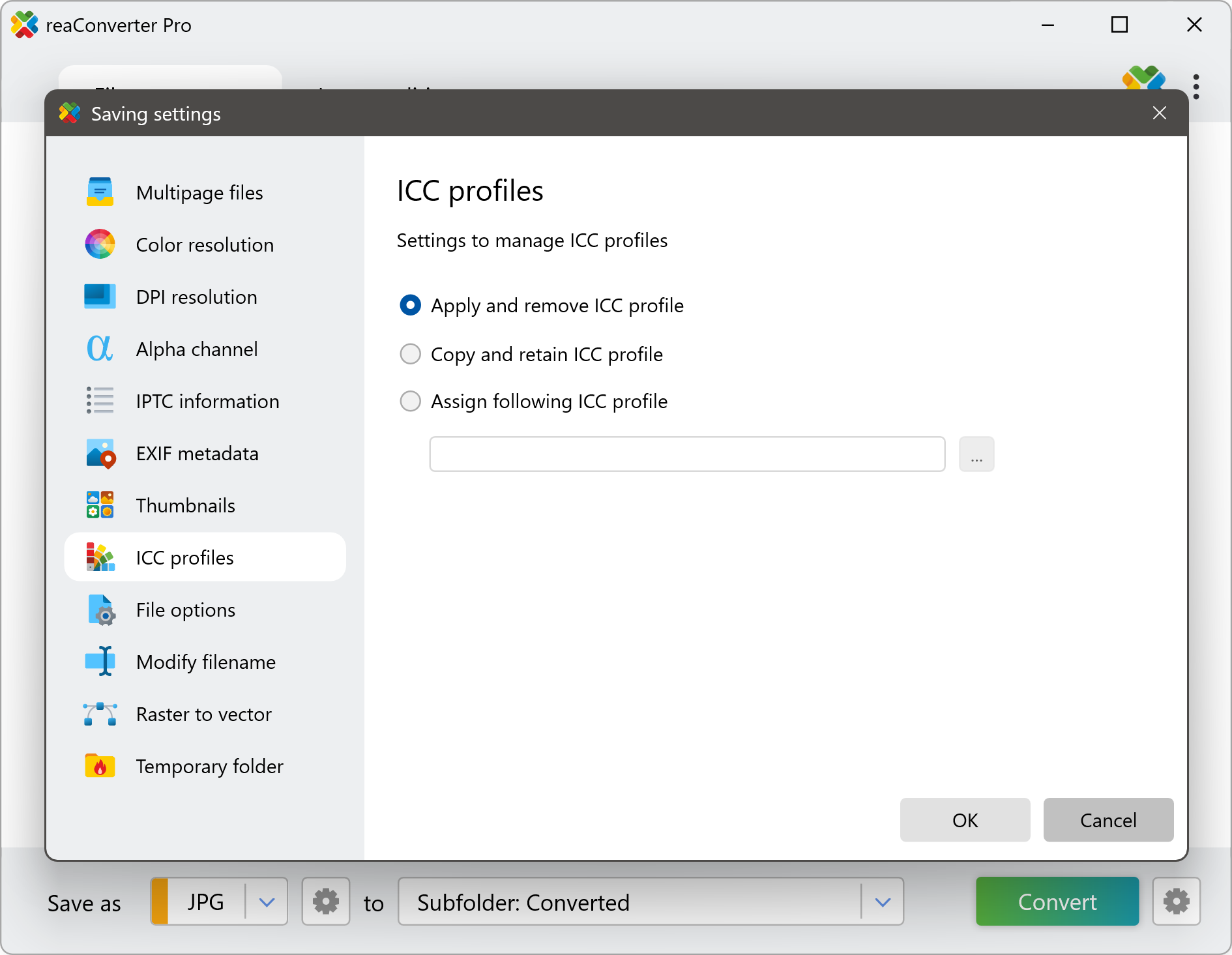 Applying the ICC profile for an image when converting it from one format to the other has a great impact on its appearance, and reaConverter lets you do both with only a few clicks.