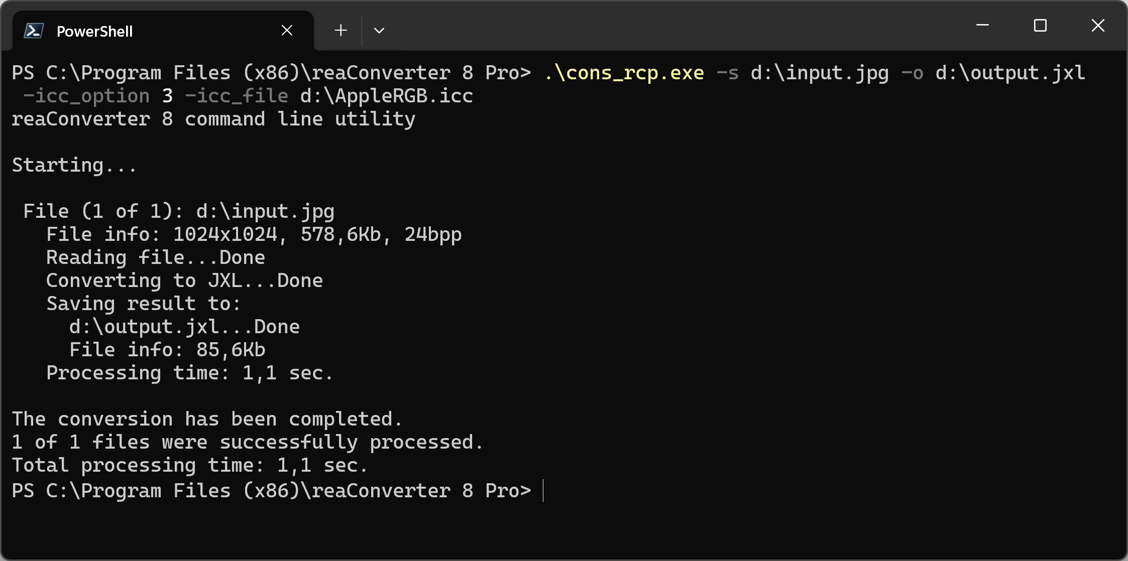 You can also apply new ICC profile using command-line interface, either manually or through automated scripts. reaConverter Pro includes a command-line tool called cons_rcp.exe — an advanced feature designed for professional use, available exclusively in the Pro edition.