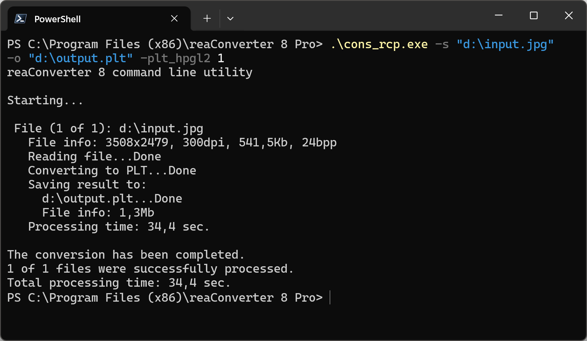 You can also convert to plt using command-line interface, either manually or through automated scripts. reaConverter Pro includes a command-line tool called cons_rcp.exe — an advanced feature designed for professional use, available exclusively in the Pro edition.