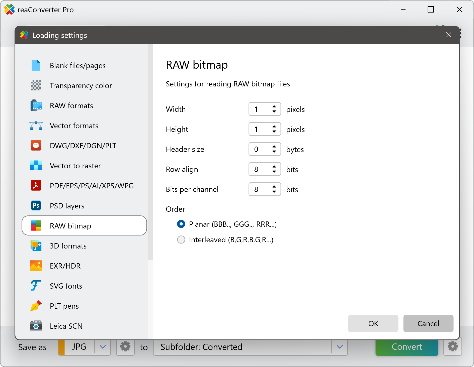 For example, if you’re working with RAW image data exported from a scientific instrument that saves in 16-bit planar format with a 128-byte header, you can input the image size, set the bit depth, define the header size, and choose Planar order. reaConverter will then correctly interpret and load the image for conversion.