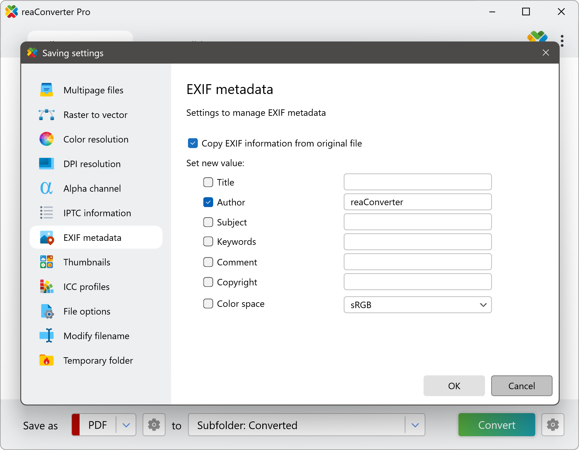 Settings new EXIF metadata during batch image conversion with reaConverter. Modify file details, remove sensitive data, or transfer metadata across hundreds of files at once