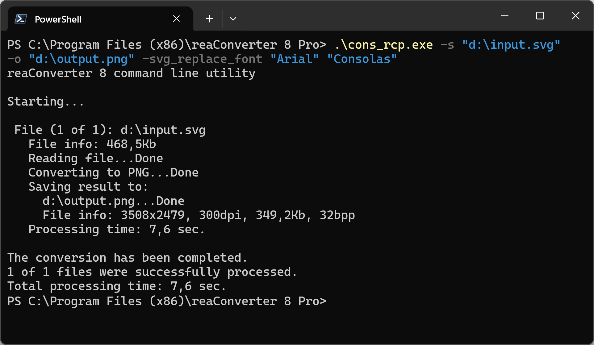 You can also replace svg fonts using command-line interface, either manually or through automated scripts. reaConverter Pro includes a command-line tool called cons_rcp.exe — an advanced feature designed for professional use, available exclusively in the Pro edition.