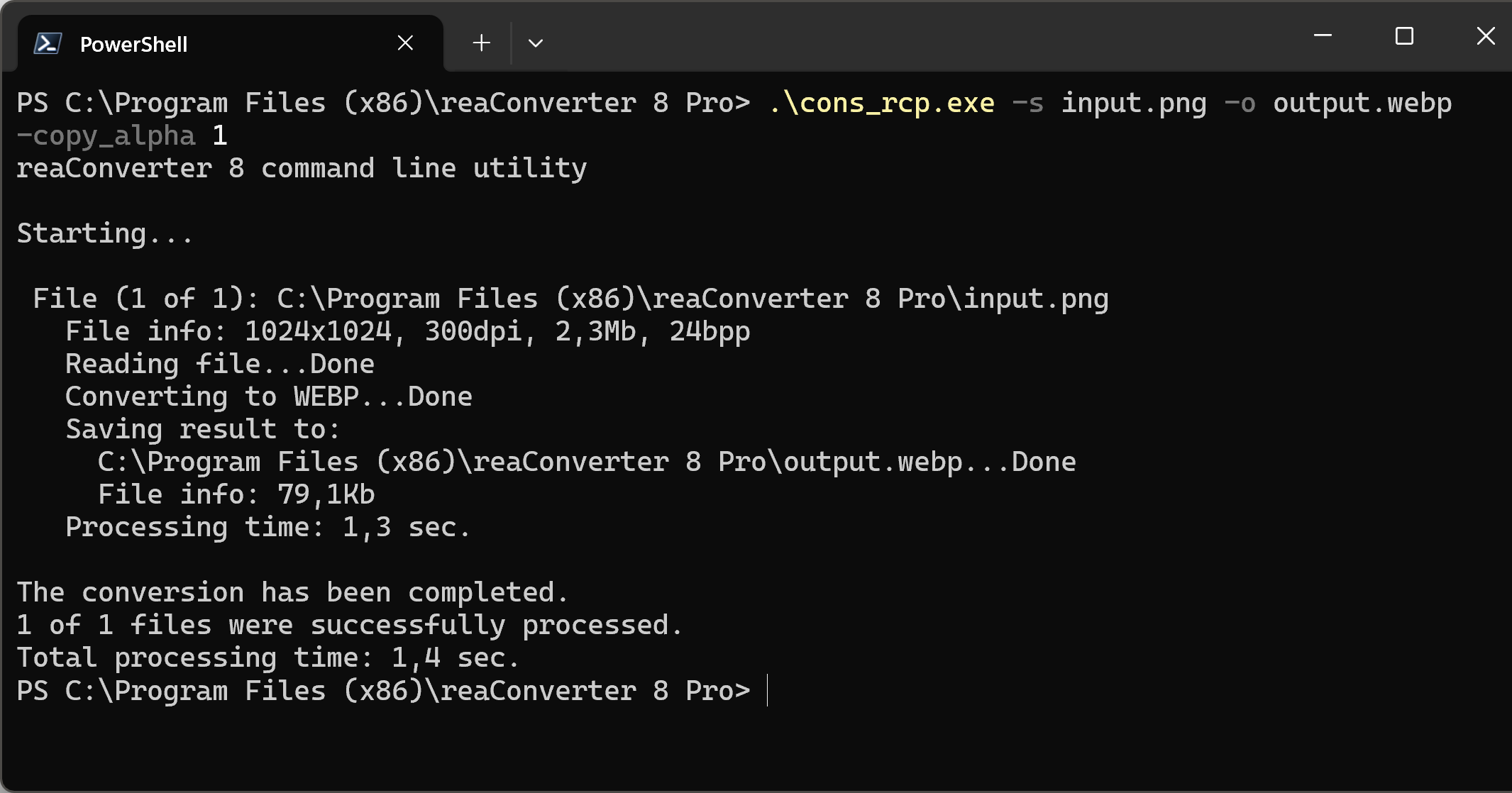 You can also transfer alpha-channel using command-line interface, either manually or through automated scripts. reaConverter Pro includes a command-line tool called cons_rcp.exe — an advanced feature designed for professional use, available exclusively in the Pro edition.