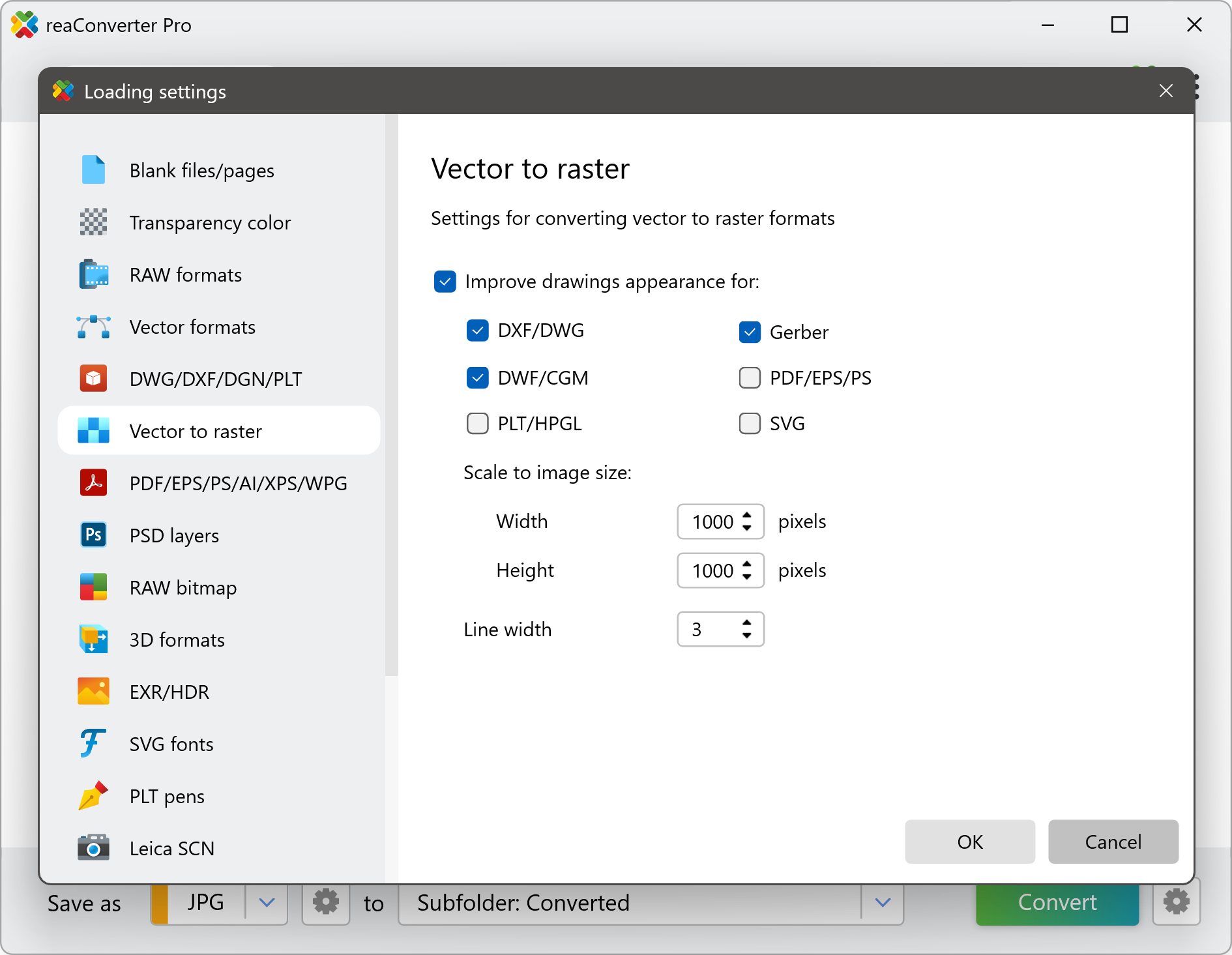 reaConverter will process the files using your custom settings — delivering clear, high-quality raster images from your original vector drawings.